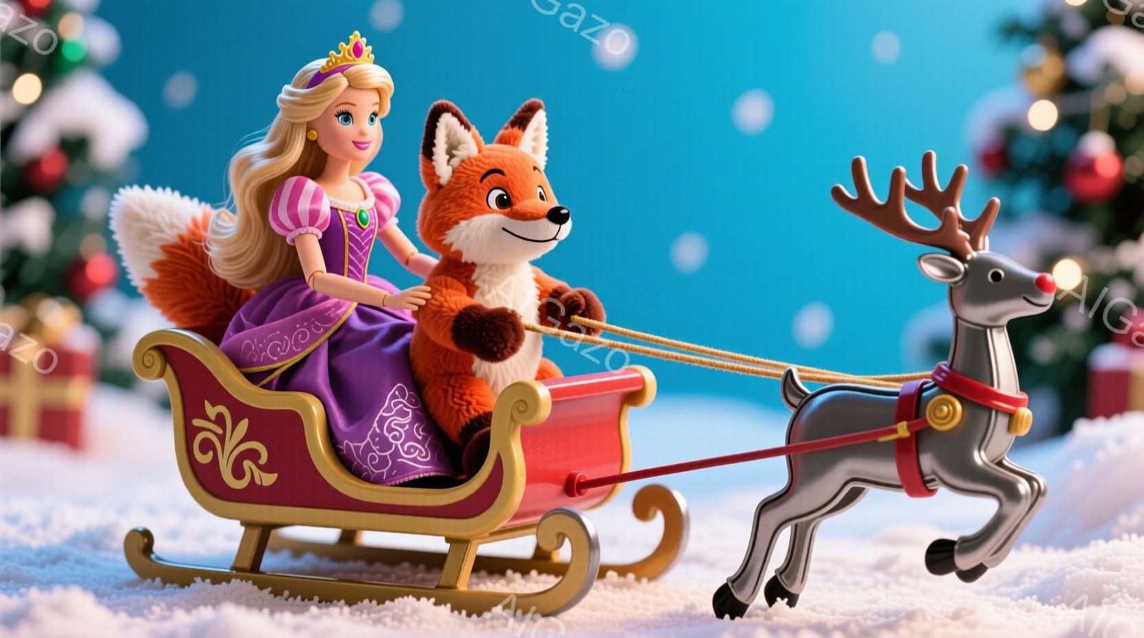 金髪碧眼の女性が紫色のドレスと金色の王冠を身につけ、そりに座っています。彼女の隣には、ふさふさした茶色の毛並みを持つ狐が寄り添っており、そりは金属製の角を持つ鹿に引かれています。背景には、雪景色とプレゼントの箱、そしてぼやけたクリスマスツリーが見え、温かく幻想的な雰囲気を醸し出しています。