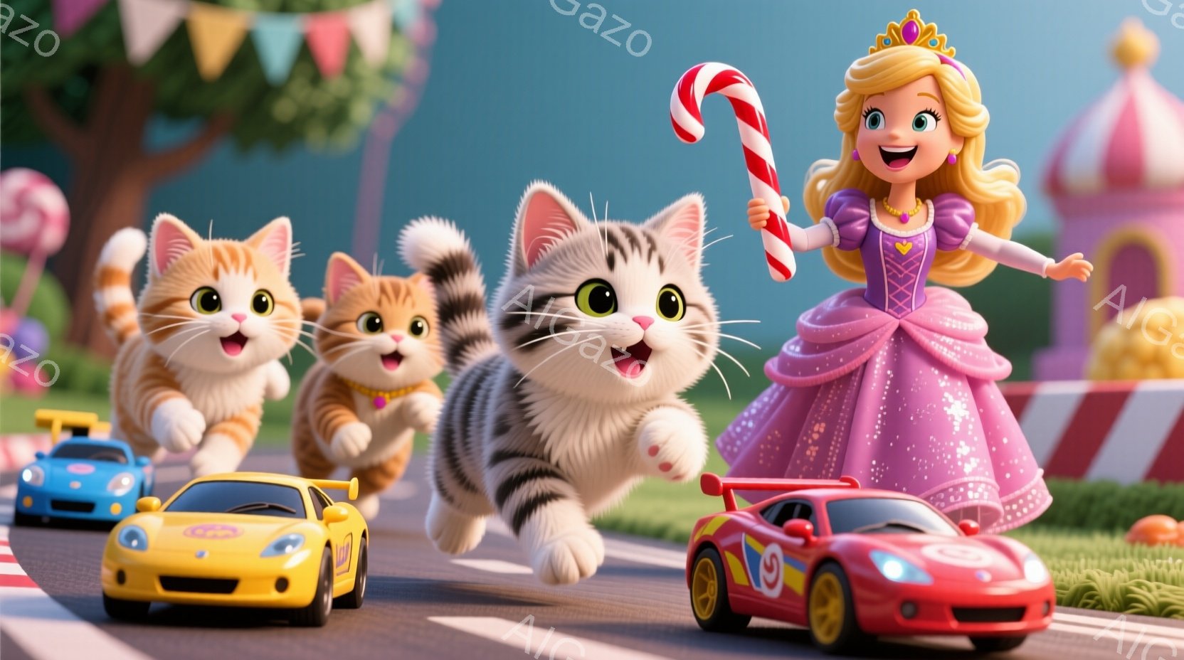 明るいピンク色のドレスを着た少女が、キャンディケーンを持ってレーストラックの上に立っています。彼女はブロンドの巻き毛で、笑顔を見せています。背景には、黄色や赤などのミニカーが走り、可愛らしい建物が並んでいます。