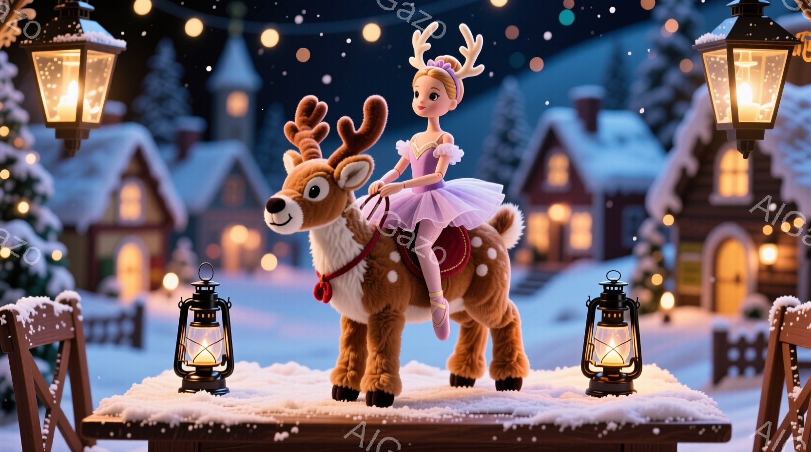 バレリーナの少女が、毛皮のようなトナカイに乗って微笑んでいます。彼女はピンクのチュチュとリボン、そして髪を高く結んだスタイルで、上品な雰囲気を醸し出しています。背景には雪に覆われた可愛らしい家々が並び、雪が舞い散る幻想的なクリスマスの夜を思わせる、温かくロマンチックな雰囲気です。