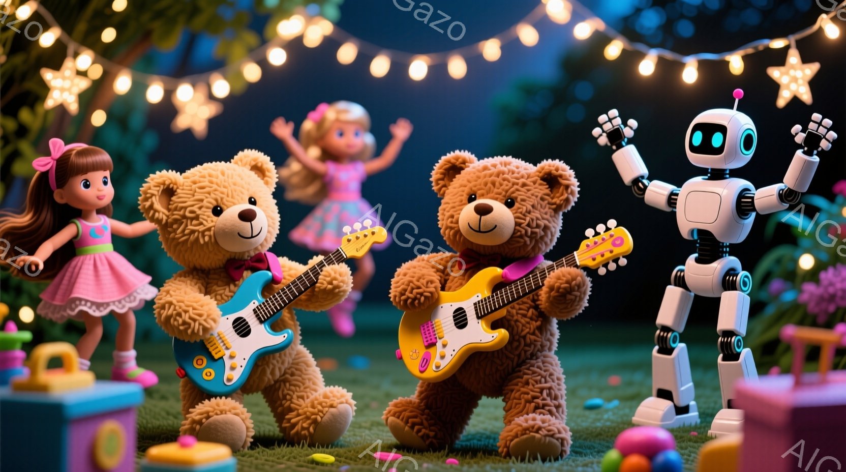 鮮やかなピンクのドレスを着た少女たちが、テディベアとロボットと共に芝生の上で楽しそうに演奏している様子が描かれています。テディベアは赤い蝶ネクタイを締め、ギターを弾いており、ロボットは腕を上げて踊っています。背景にはカラフルな積み木が散らばり、上空には電球が飾られた装飾が施され、楽しいお祭りやパーティーのような雰囲気を醸し出しています。