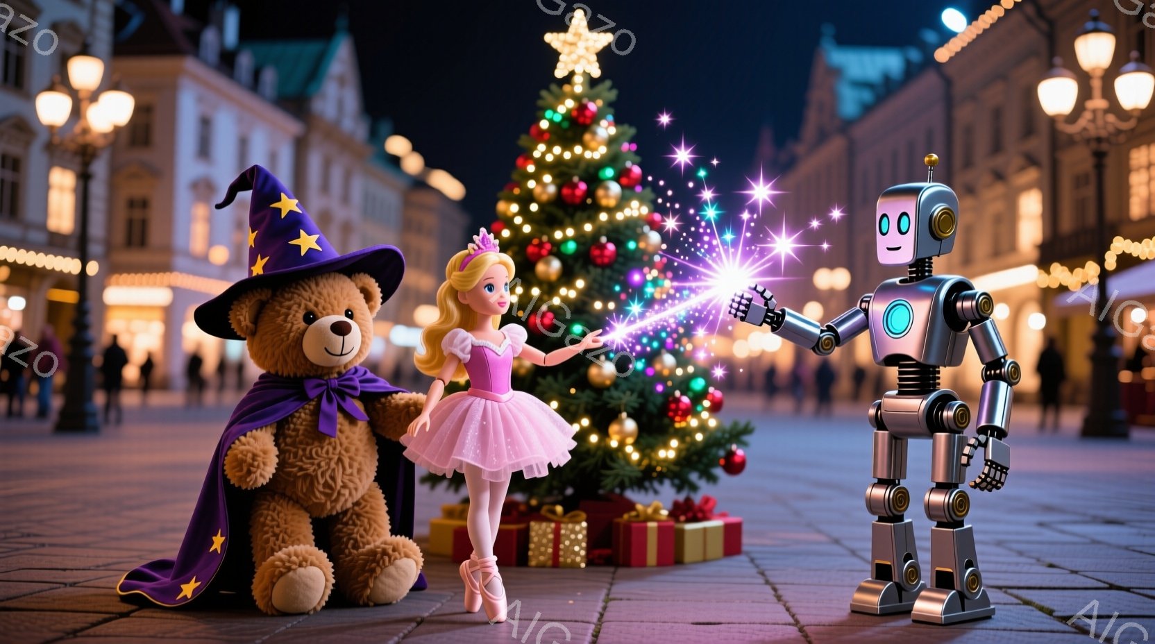 広場には、大きなクリスマスツリーが輝き、プレゼントの箱が置かれています。左には魔法使いの帽子をかぶったテディベア、中央にはピンクのバレリーナ衣装を着た人形、右には銀色のロボットが立っており、バレリーナは魔法のような光のパーティクルを手にしています。背景には美しい建物が並び、夜空が広がいており、暖かく幻想的な雰囲気が漂っています。