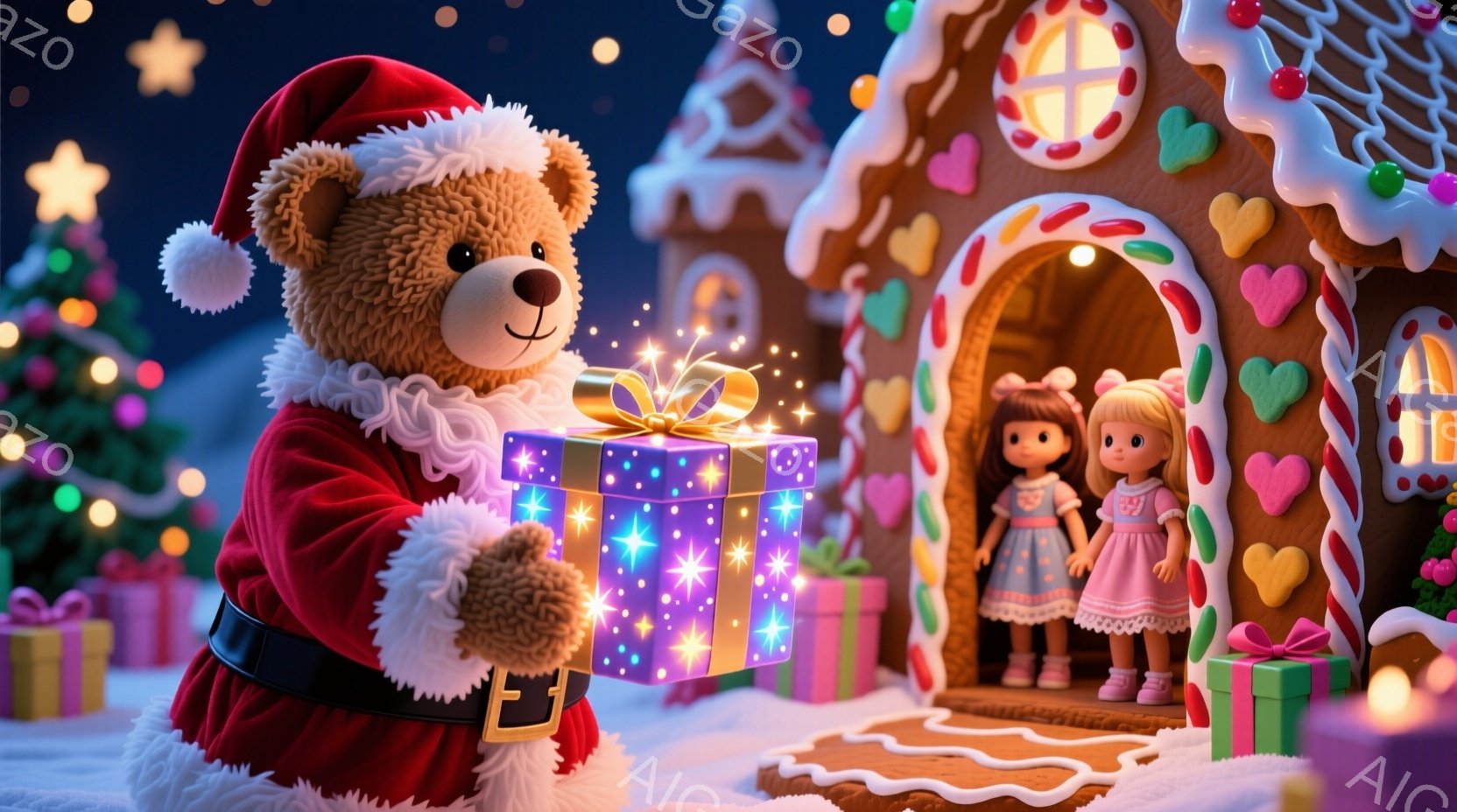 大きなテディベアがサンタクロースの衣装を着て、緑色のリボンのかかったプレゼントを前に差し出しています。背景には、お菓子で飾られた可愛らしいジンジャーブレッドハウスと、ピンクと白のドレスを着た二人の人形が立っています。雪が降る夜空の下、暖かく甘いクリスマスの雰囲気が漂っています。