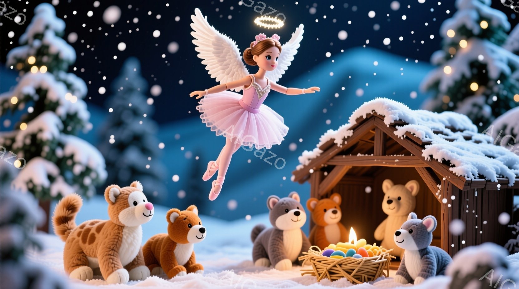 雪景色の中に、白いドレスと羽根の妖精が舞い降りている様子が描かれています。妖精はバレリーナのような姿で、ピンク色のリボンが巻かれた金髪を持ち、微笑んでいます。背景には、藁とキャンドルが置かれた小さな木造の小屋と、雪をまとった針葉樹林が広がり、温かく幻想的な雰囲気を醸し出しています。