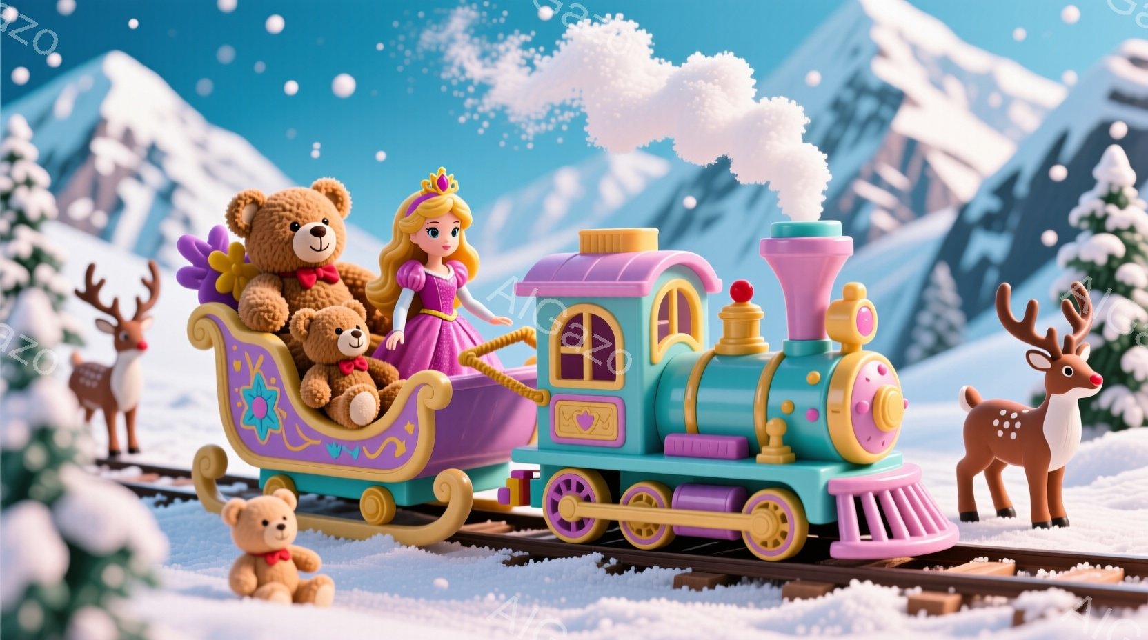 雪景色の中、ピンクと水色の可愛らしい汽車が走っています。プリンセスのような少女は紫色のドレスを着て、茶色の熊のぬいぐるみと一緒に汽車に乗っており、笑顔で手を振っています。背景には雪をまとった山々が広がり、汽車を先導する2頭の鹿が、冬の幻想的な雰囲気を演出しています。