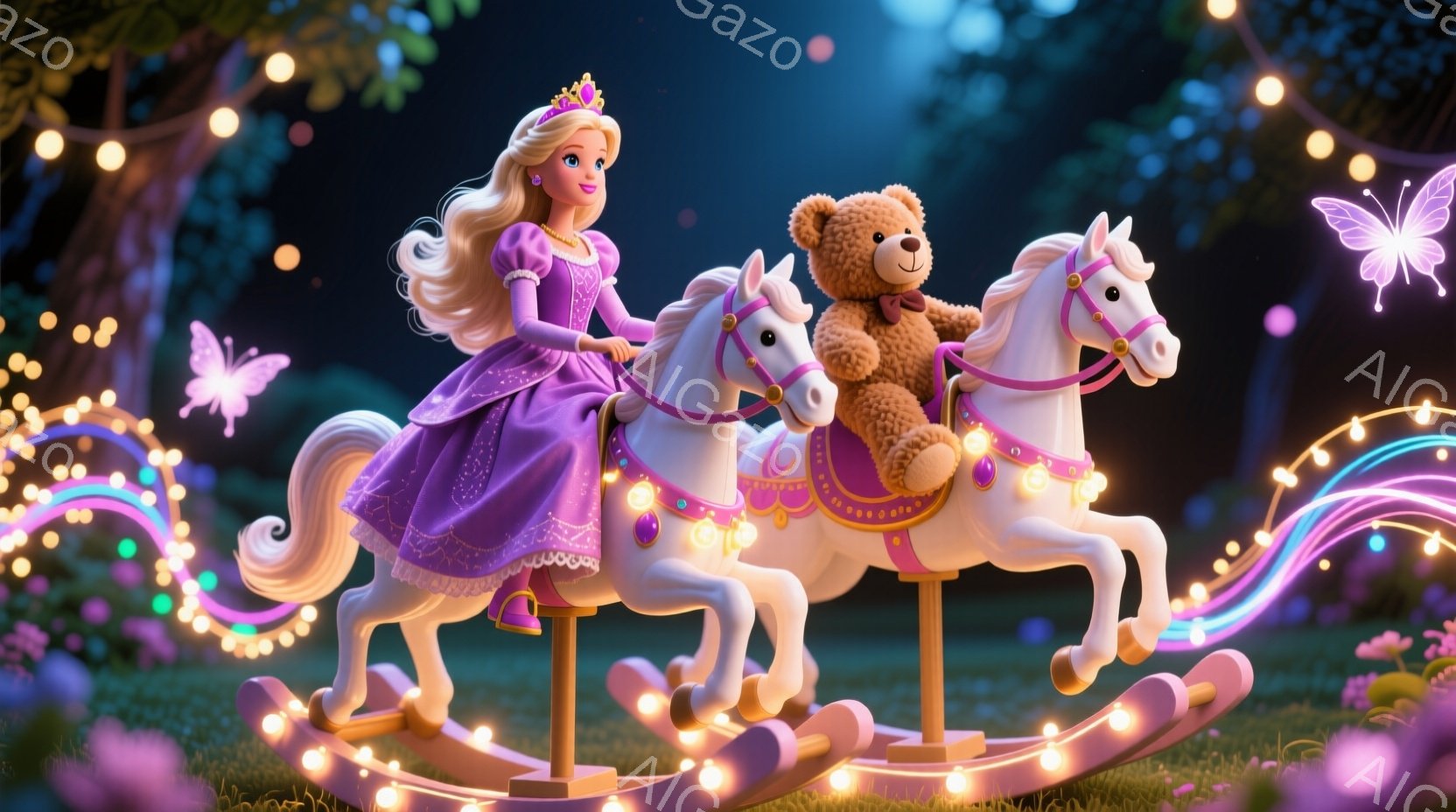 金髪の少女はピンク色のドレスと王冠を身に着け、白い木馬に乗っています。茶色のテディベアも木馬に座っており、二人は楽しそうに前を見つめています。背景にはぼんやりとした緑の風景と、きらめく光の粒子が散りばめられており、幻想的で夢のような雰囲気を醸し出しています。