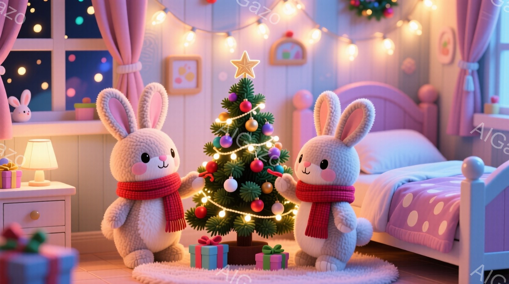 明るい寝室で、2匹のふわふわしたウサギがクリスマスツリーの周りに立っています。ウサギたちは緑と赤のストライプのセーターを着ており、嬉しそうな表情でツリーを眺めています。背景にはベッドやプレゼントボックスがあり、クリスマスの飾り付けが施された暖かい雰囲気が漂っています。