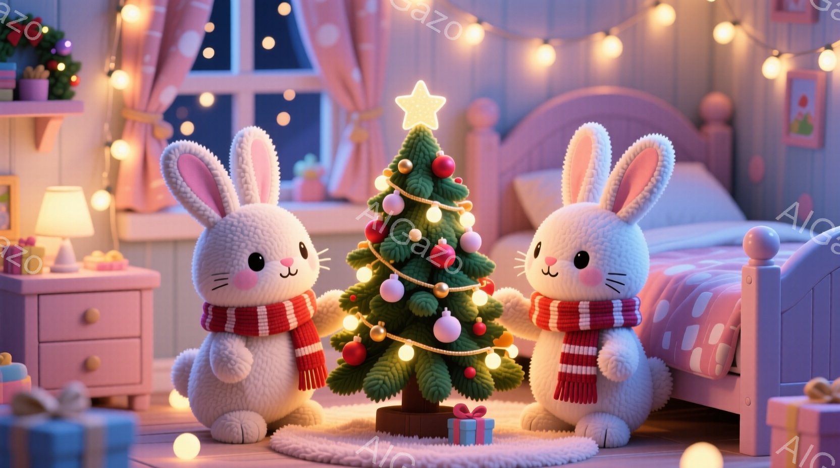 ふわふわの白いウサギが2匹、クリスマスツリーの前に立っています。青と赤のストールを巻いており、それぞれ穏やかな笑顔を浮かべています。背景には、ピンク色のベッドとナイトテーブル、そしてキラキラと輝くクリスマスライトが見え、暖かく、お祝いの雰囲気が漂っています。