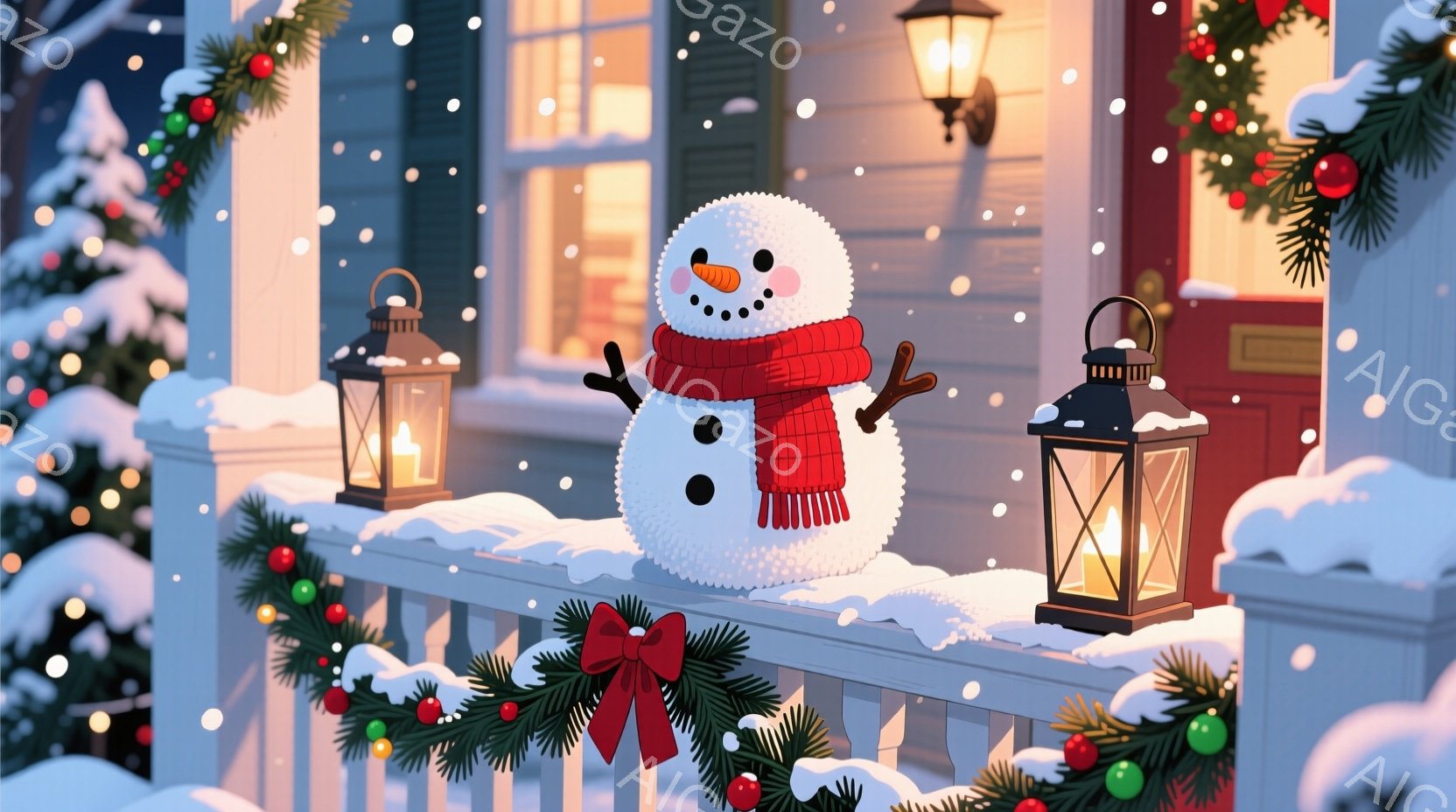 雪が降る寒い夜、バルコニーに雪だるumaが立っている。赤いマフラーと黒い枝の腕を持ち、笑顔で幸せな雰囲気を醸し出している。背景には、クリスマスツリーと点灯した窓があり、暖かく穏やかな冬の夜の雰囲気を強調している。