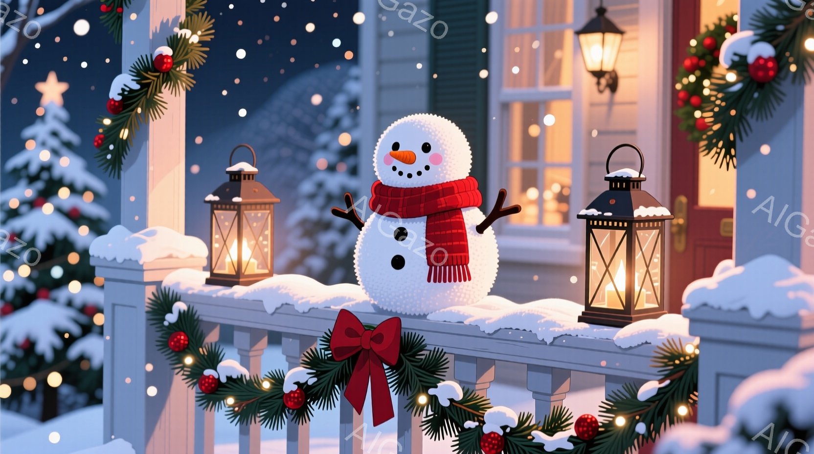 雪が降る中に、バルコニーに置かれた雪だるまが微笑んでいます。赤いマフラーと木の枝で作られた腕を持ち、白い背景に映える可愛らしい姿です。バルコニーにはクリスマスツリーの飾り付けと灯りが灯ったランタンがあり、暖かく穏やかな冬の雰囲気を醸し出しています。