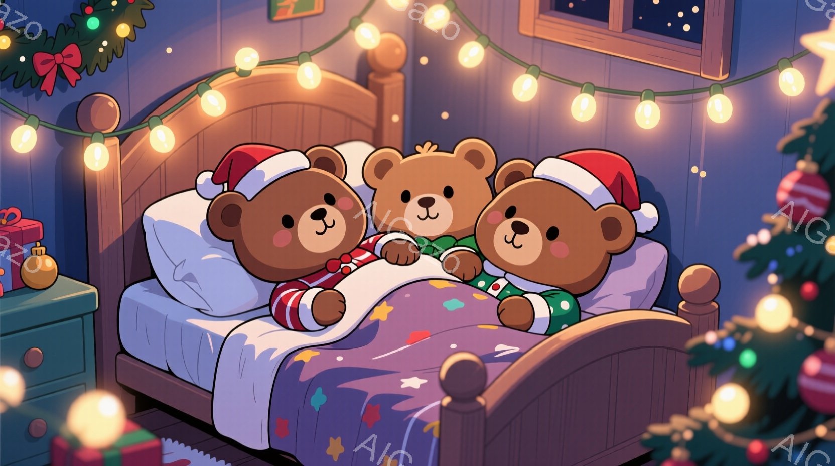暖炉のそばに置かれたベッドに、クリスマスの衣装を着た2匹のテディベアが横たわっています。片方のクマは赤いサンタ帽をかぶり、もう一方のクマは緑色のパジャマを着ています。背景にはクリスマスツリーの飾りと、雪が降る夜空が見え、温かく幸せなクリスマスの雰囲気を醸し出しています。
