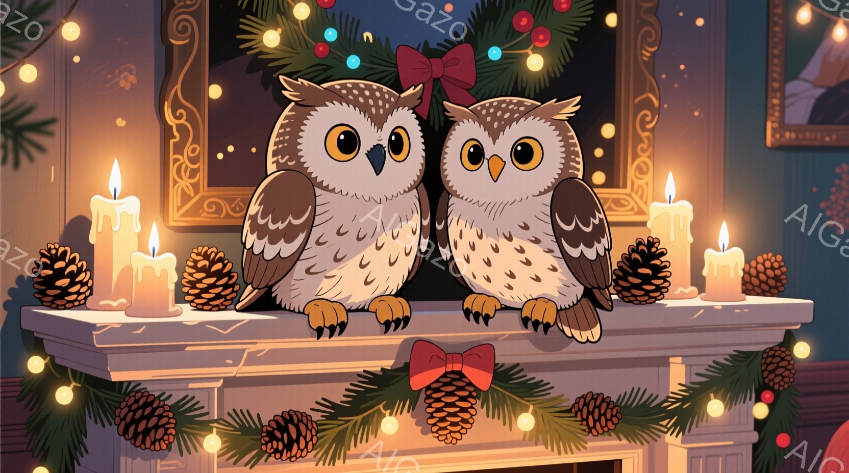 暖炉の上に2羽のフクロウが並んで座っており、クリスマスの飾り付けが施された背景が特徴的です。フクロウは大きな目で見つめ、可愛らしい表情をしています。暖炉の上には松ぼっくりや赤いリボン、点灯したキャンドルが配置され、温かく幻想的なクリスマスの雰囲気を醸し出しています。