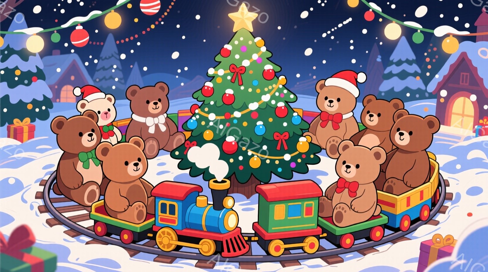 クリスマスツリーを背景に、可愛らしいクマの列車が描かれています。クマたちはそれぞれクリスマスらしい服装を身に着け、楽しそうな表情をしています。雪が舞う冬の背景には、プレゼント箱が置かれ、全体的に温かく、お祝いムード満載の雰囲気です。