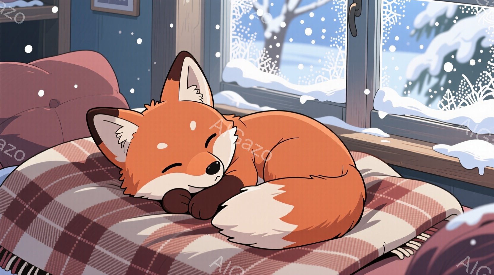 温かい毛布の上に丸まって眠っているオレンジ色の狐が描かれています。窓の外には雪が降り積もり、木々が見える冬の風景が広がっています。室内は暖かく、穏やかな雰囲気が漂い、狐は安らかに眠っている様子です。