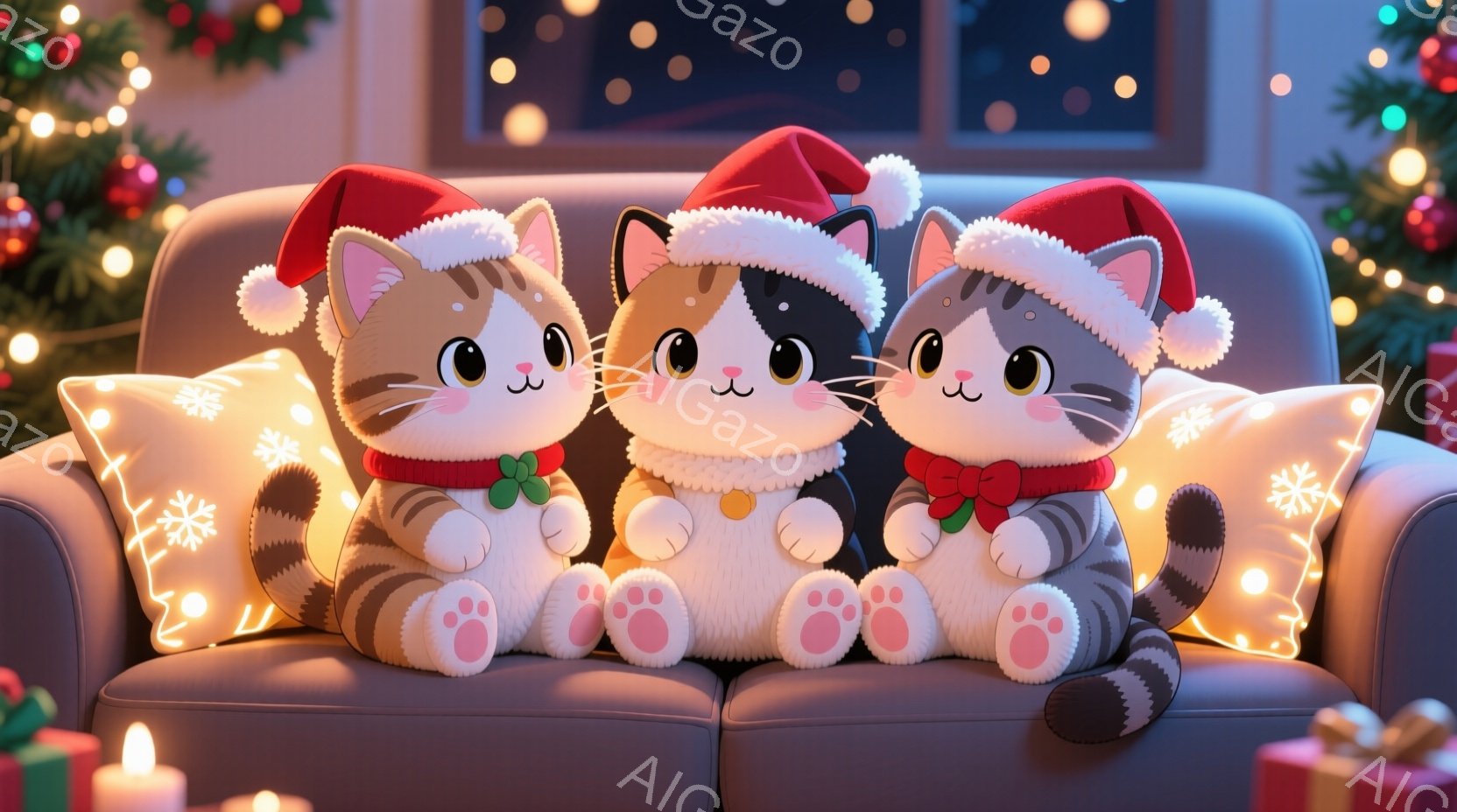3匹の愛らしい猫が、クリスマスの飾り付けがされたソファに並んで座っています。それぞれの猫は赤いサンタの帽子と赤いまたは緑のリボンをつけており、丸いピンク色の肉球が特徴的です。背景には、クリスマスツリーの輝きとギフトボックスがあり、暖かく幸せなクリスマスの雰囲気を醸し出しています。