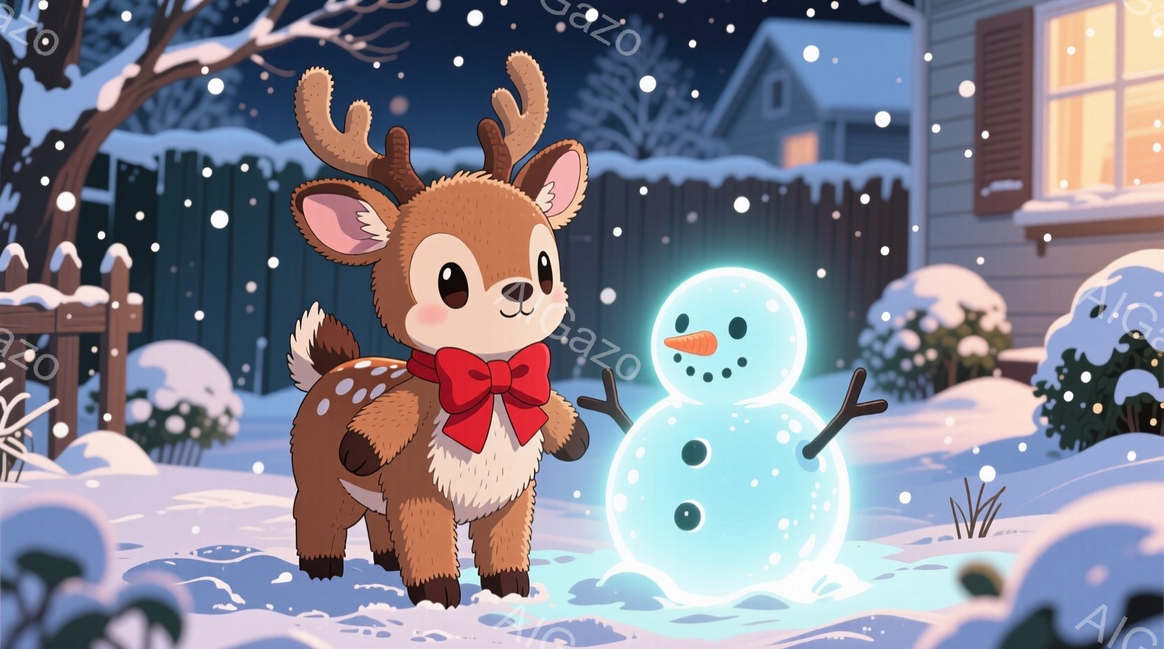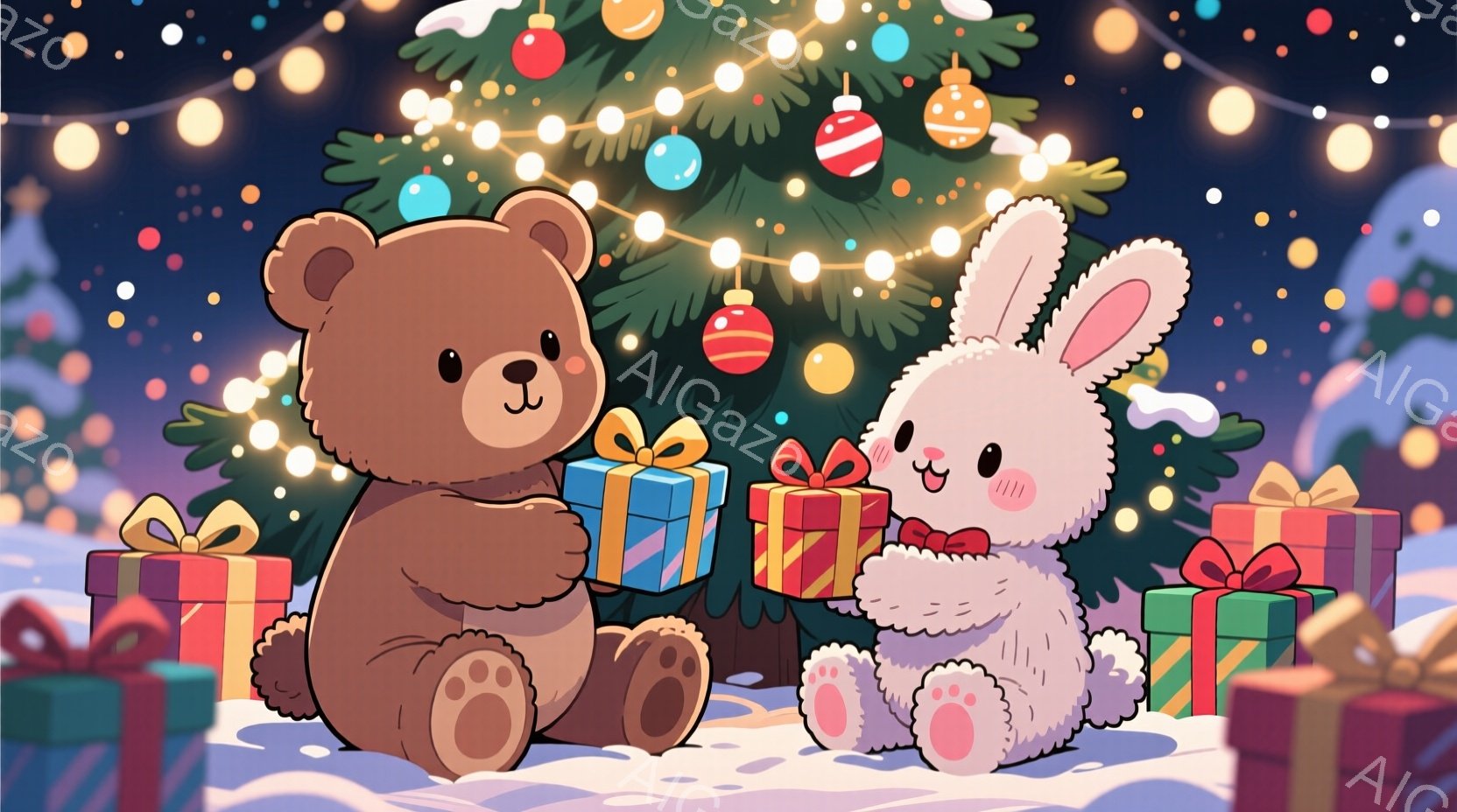 この無料AI生成画像「温かい雰囲気のイラストで、大きなクマと白いウサギがプレゼントを交換しています。クマは茶色い毛並みで、ウサギはピンク色の耳と赤いリボンをつけており、どちらも笑顔で幸せそうに見えます。背景にはクリスマスツリーが飾られ、雪が降る夜の街並みが広がり、お祝いムードが漂っています。」は、2025年10月25日に作成されました。 サイズは 1664×928px の高解像度で、商用利用も可能なフリー素材として提供しています。