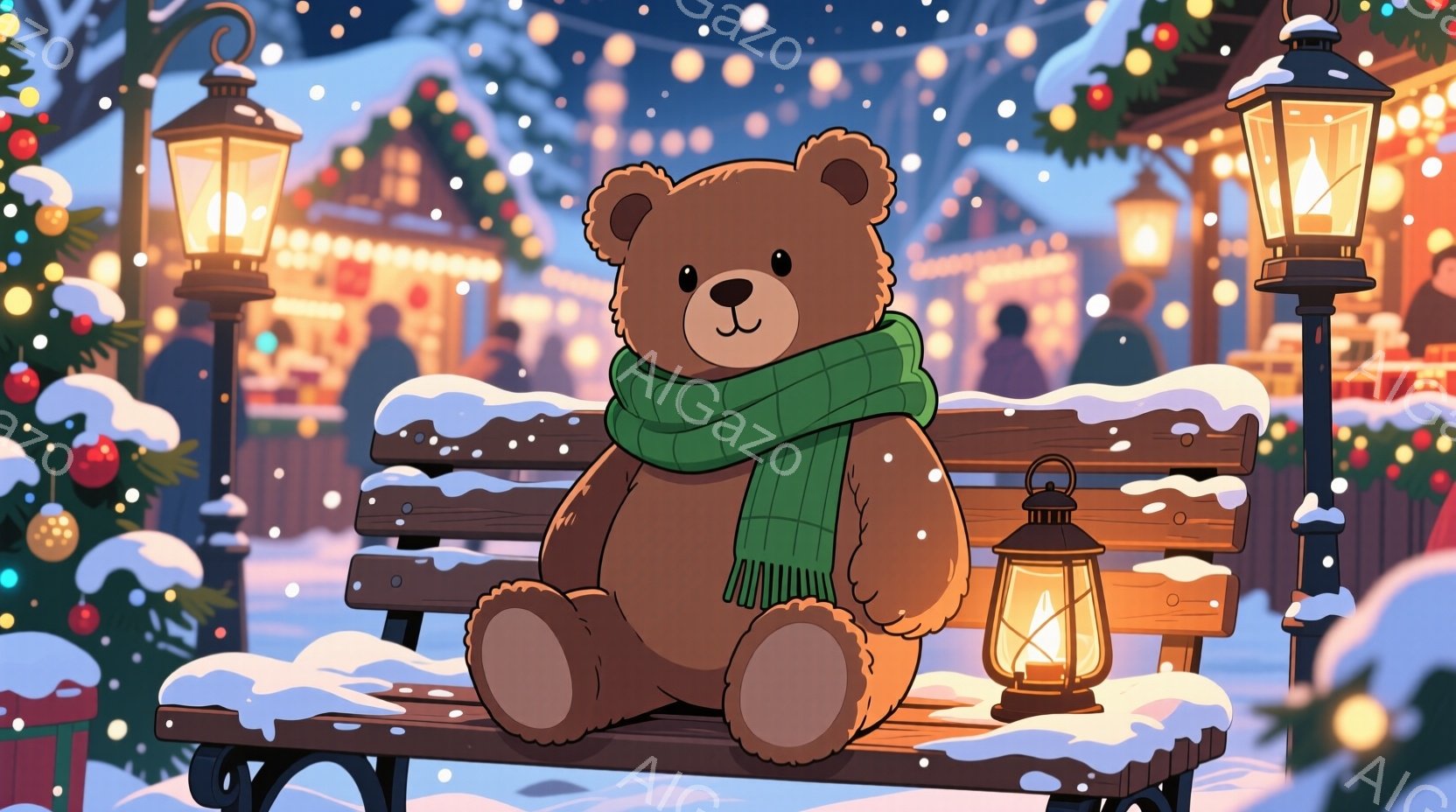 霜降る夜のベンチに座るテディベアが描かれています。緑のストールを巻き、暖炉の灯りのように温かい雰囲気を醸し出しています。背景にはクリスマスマーケットのような賑やかな光景が広がり、雪が舞う幻想的な冬の夜を表現しています。
