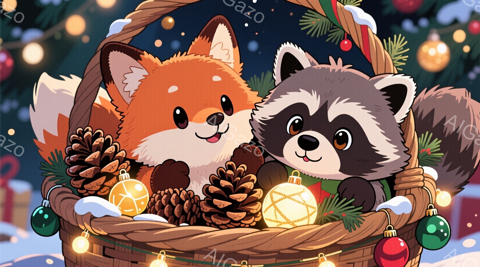 オレンジ色のキツネと灰色のタヌキが、松ぼっくりと輝くクリスマスオーナメントで満たされたバスケットの中に座っています。両者は微笑んでおり、暖かくお祝いの雰囲気の静止画です。背景には白い雪が舞い、暗い背景にカラフルな光が散りばめられています。