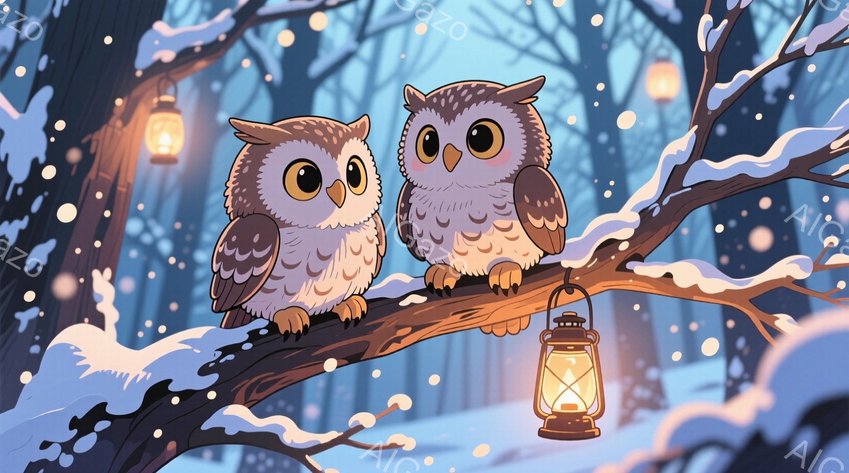 雪が舞う森の中で、二羽のフクロウが雪に覆われた木の枝に並んで座っています。どちらも丸い目をしており、可愛らしい表情をしています。背景には、ぼんやりと光るランタンがいくつか吊るされ、幻想的な冬の雰囲気を醸し出しています。