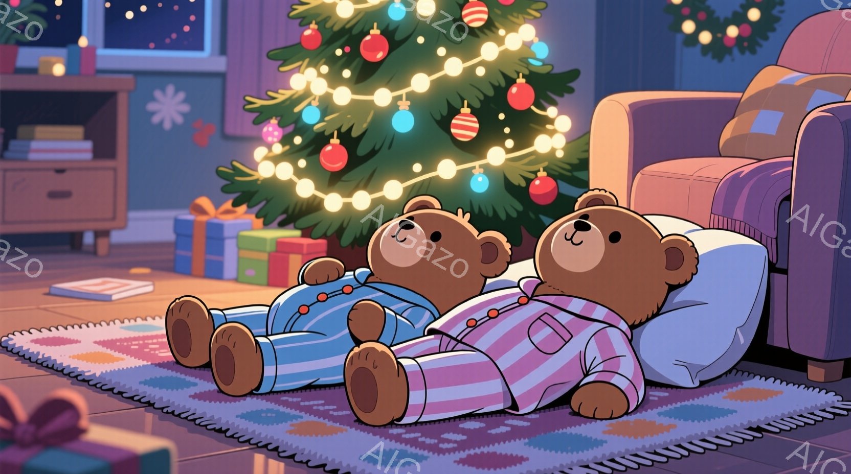 暖炉のあるリビングルームで、2匹のテディベアがパジャマ姿で円形の赤い絨毯の上に横たわっています。クリスマスツリーが暖かく光り、プレゼントが周囲に置かれています。全体的に、温かく、居心地の良い、クリスマスの夜の雰囲気が漂っています。