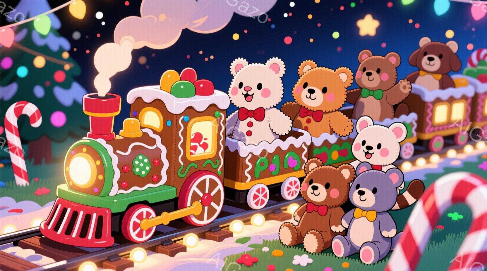 暖かく遊び心のある風景で、クマのぬいぐるみたちが、キャンディーやクッキーで飾られた列車に乗って進んでいます。列車はチョコレート色で、縁には雪のように白いクリームが施され、車輪は赤と白のストライプです。背景には、カラフルなキャンディーケーンや緑の木々が点在し、全体的にハッピーで祝祭的な雰囲気を醸し出しています。