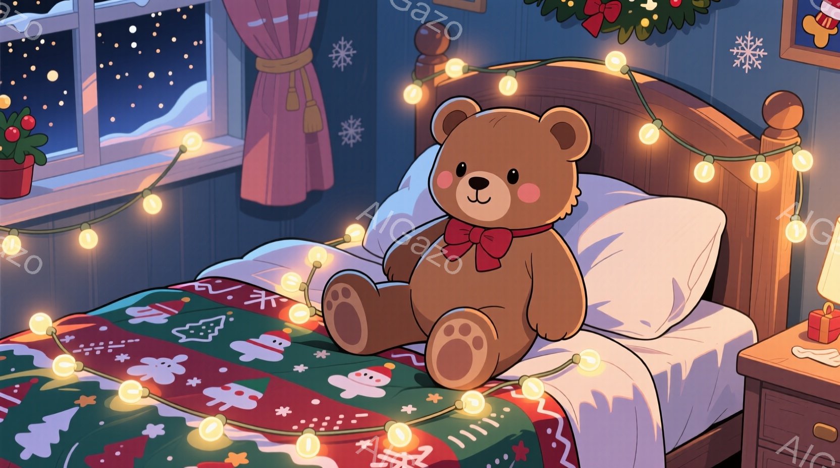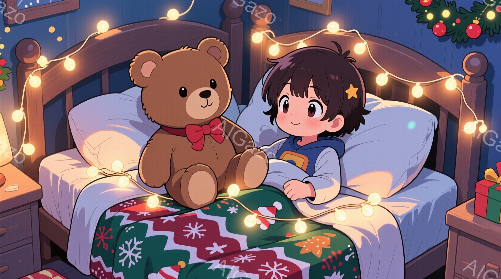 茶色の巻き毛の少女がベッドに座り、赤いリボンをつけた大きなテディベアを抱きかかえています。彼女は赤いパジャマを着ており、頬を赤らめ、幸せそうな表情をしています。背景には、クリスマスツリー、プレゼント、そしてベッド周囲を飾る温かい光のイルミネーションがあり、暖かく居心地の良いクリスマスの雰囲気を作り出しています。
