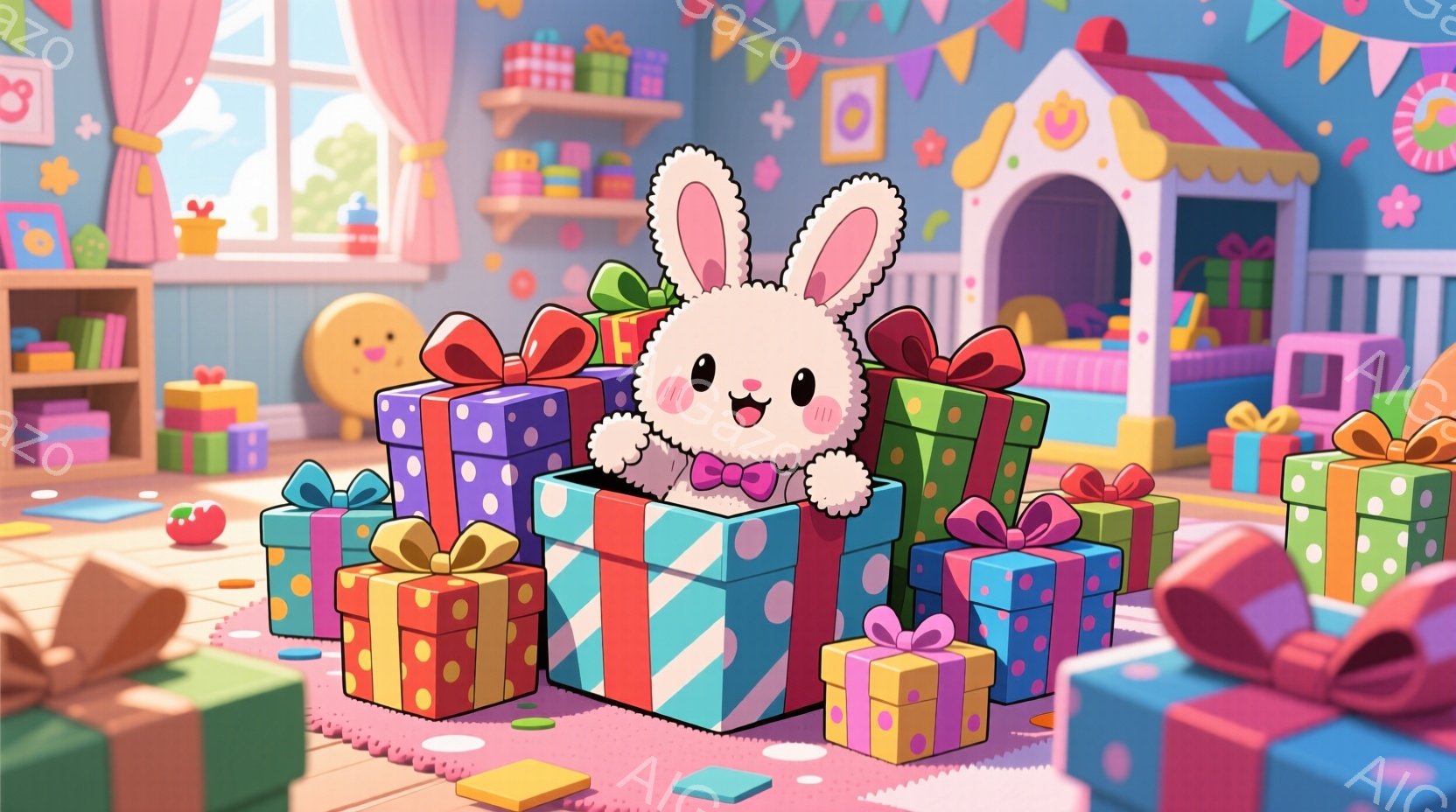 白い子ウサギがカラフルなプレゼントの山から顔を出し、赤いリボンをつけています。背景にはピンクと水色のストライプの壁、おもちゃや本が並んだ棚、そして丸い形のラグが見え、明るく楽しい雰囲気が漂っています。全体的にパステルカラーで統一され、子供部屋のような可愛らしい空間が表現されています。