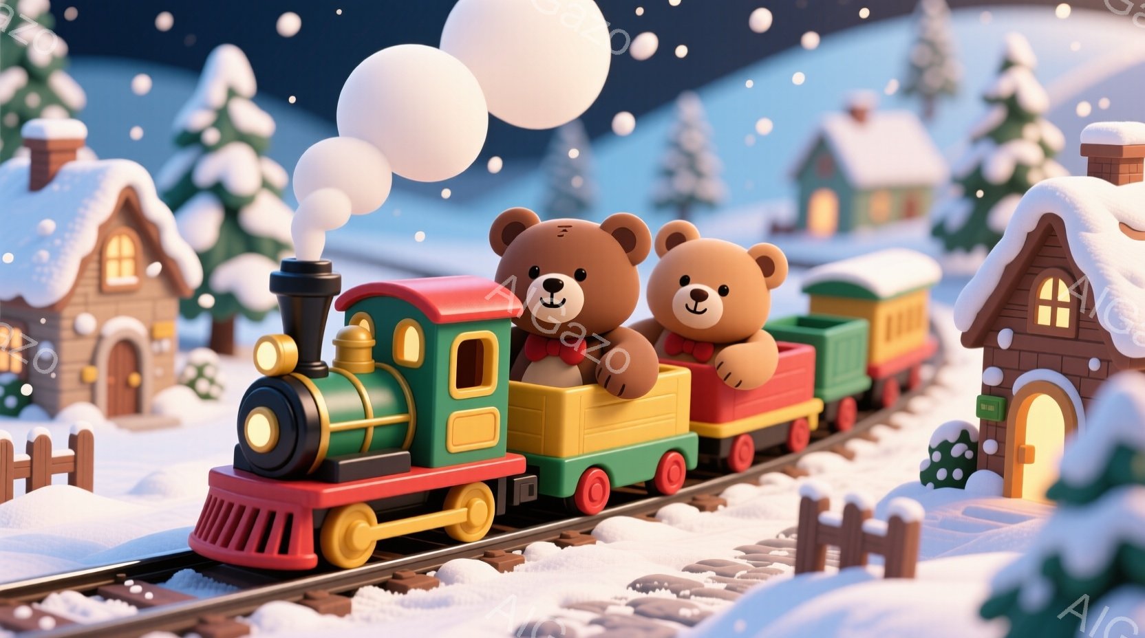 カラフルな汽車に乗った3匹のテディベアが描かれています。彼らは皆笑顔で、楽しそうに汽車に乗っています。背景には雪景色の中に可愛らしい家々が並び、雪が舞う冬の暖かく幻想的な雰囲気を醸し出しています。