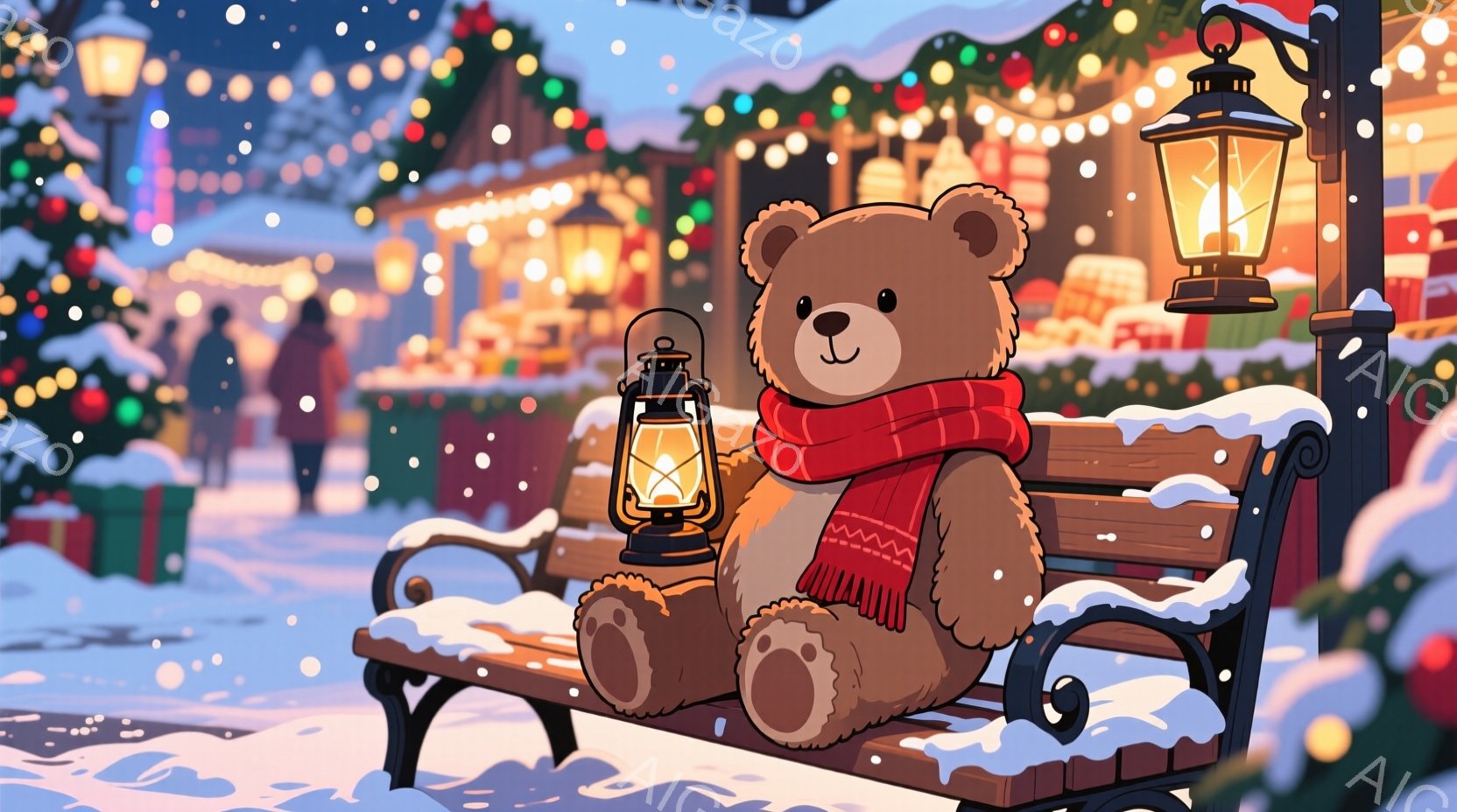 雪が降るクリスマスのベンチに座る、茶色のテディベアが描かれています。ベアは赤いストールを首に巻き、リラックスした表情で、足元には大きな肉球が見えます。背景には、クリスマスツリーや提灯で飾られた活気のある市場と、雪景色が広がり、温かく幸せな雰囲気を醸し出しています。