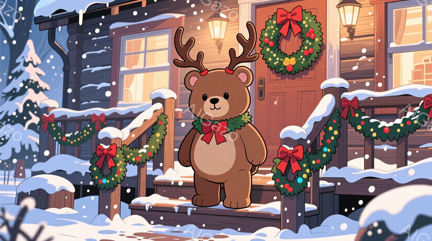 雪が降り積もる家の前に、トナカイの角を付けたクマのぬいぐるみが立っています。クマは赤いリボンで飾られ、前足は体側にぴったりと添えられています。背景には、クリスマスリースで飾られた木造の家があり、暖かく、お祝いの雰囲気です。