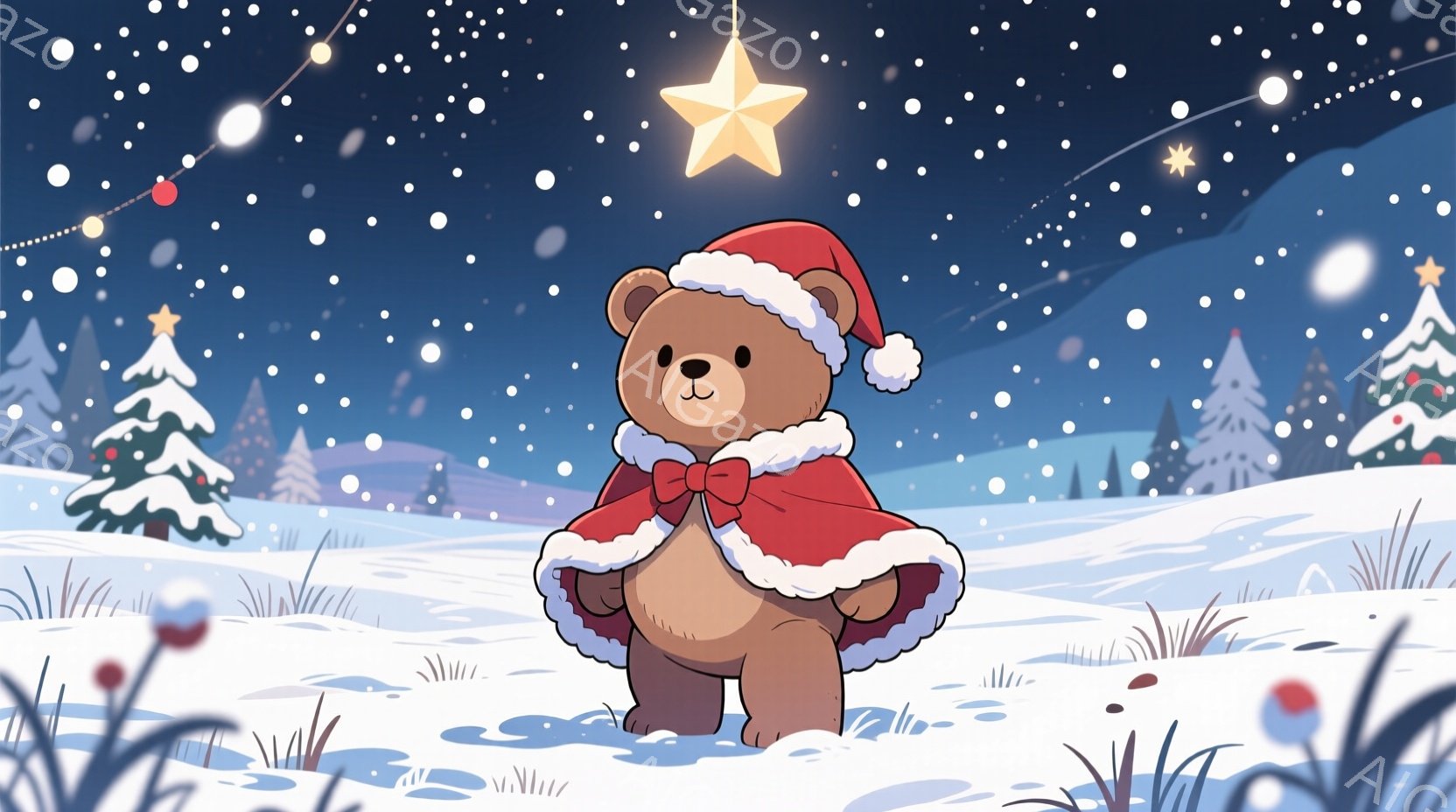 ぬいぐるみのようなクマが、赤いサンタ帽と赤いマントを身に着けて立っています。その表情は穏やかで、わずかに微笑んでいるように見えます。背景には雪景色が広がり、遠くに木々が見え、空には星や雪の結晶が散りばめられて、冬の暖かい雰囲気を醸し出しています。