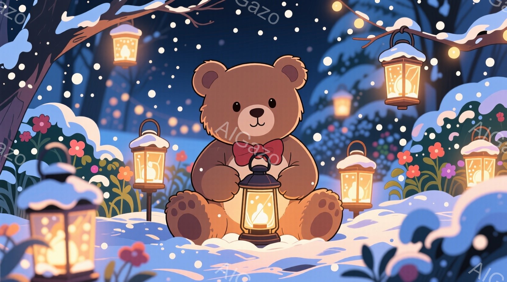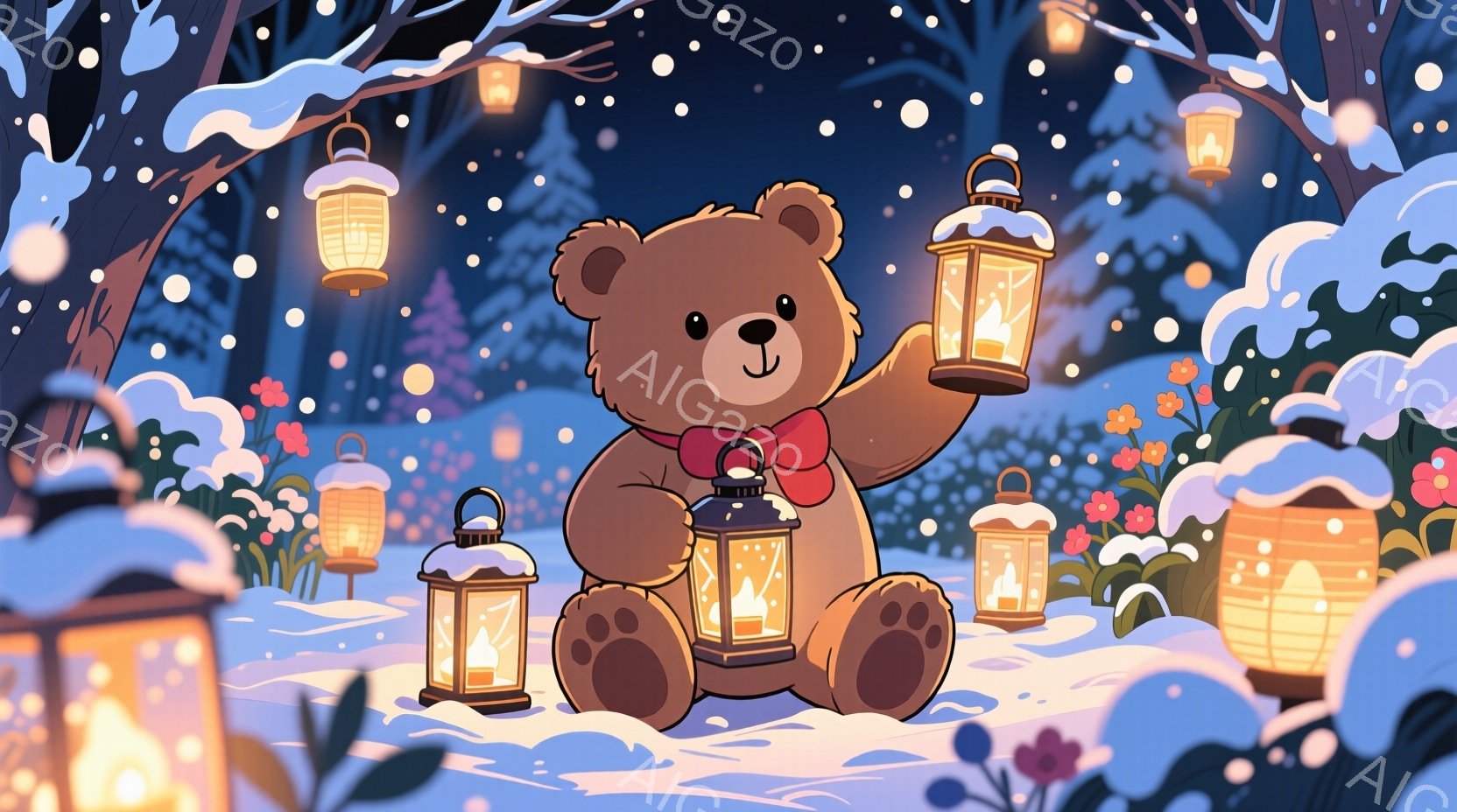 茶色のクマが雪景色の中でランタンをいくつか持っています。クマは赤いリボンをつけており、お座りポーズで可愛らしい表情をしています。背景には雪に覆われた木々や植物があり、空からは雪が舞い降りており、暖かく幻想的な雰囲気です。