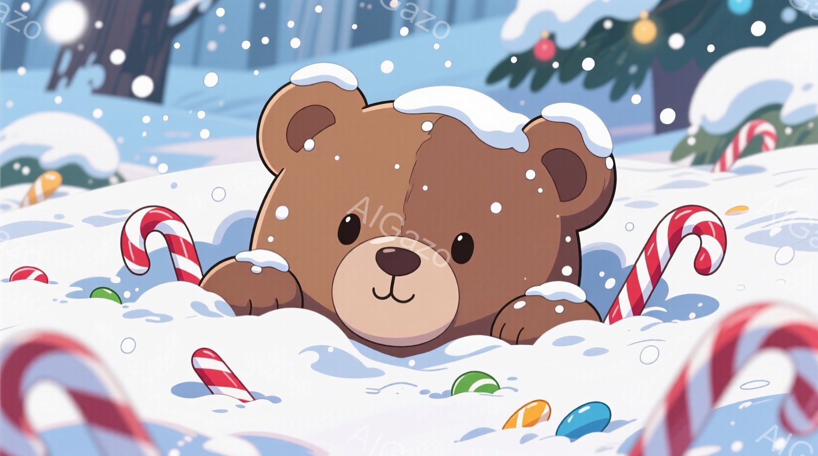 茶色のテディベアが雪の中に埋もれている様子が描かれています。周りにはキャンディケーンやカラフルな粒状のお菓子が散らばっており、雪が降り積もる冬の景色が広がっています。テディベアは頬を赤らめ、可愛らしい表情で、暖かく穏やかな雰囲気を醸し出しています。