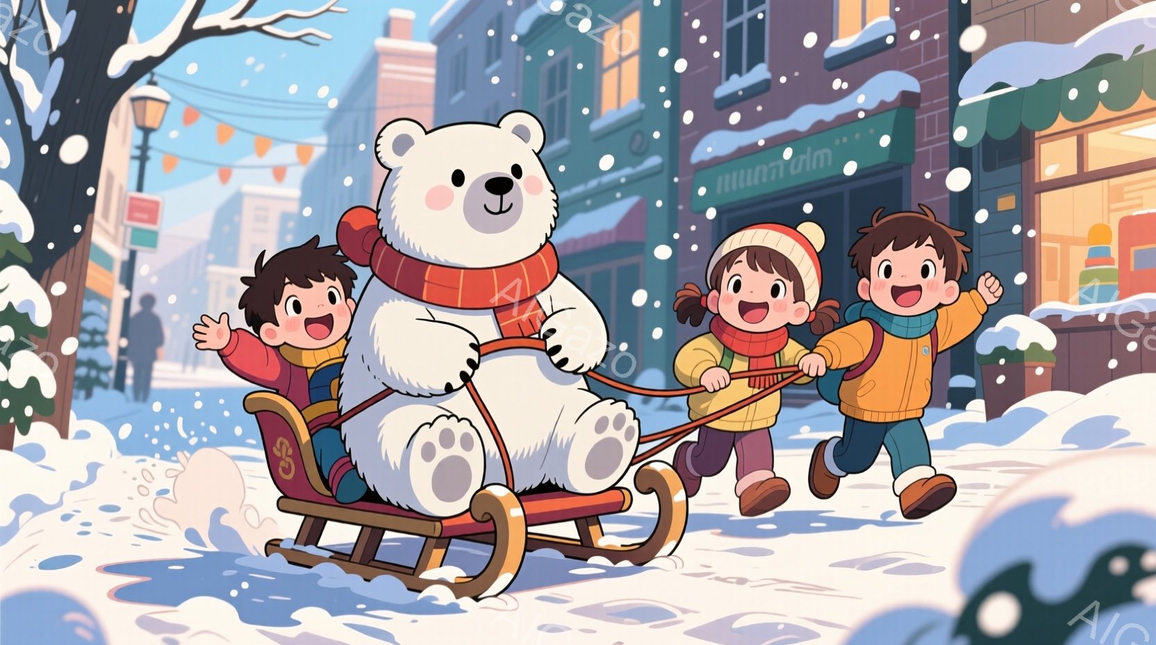 雪景色の中に、大きな白い熊がソリを引いて子供たちを連れています。子供たちは皆、赤い帽子とカラフルな冬の服を着て、笑顔でソリを引き、とても楽しそうです。背景には雪で覆われた建物や木々があり、クリスマスの飾り付けも見え、暖かい冬の雰囲気が漂っています。