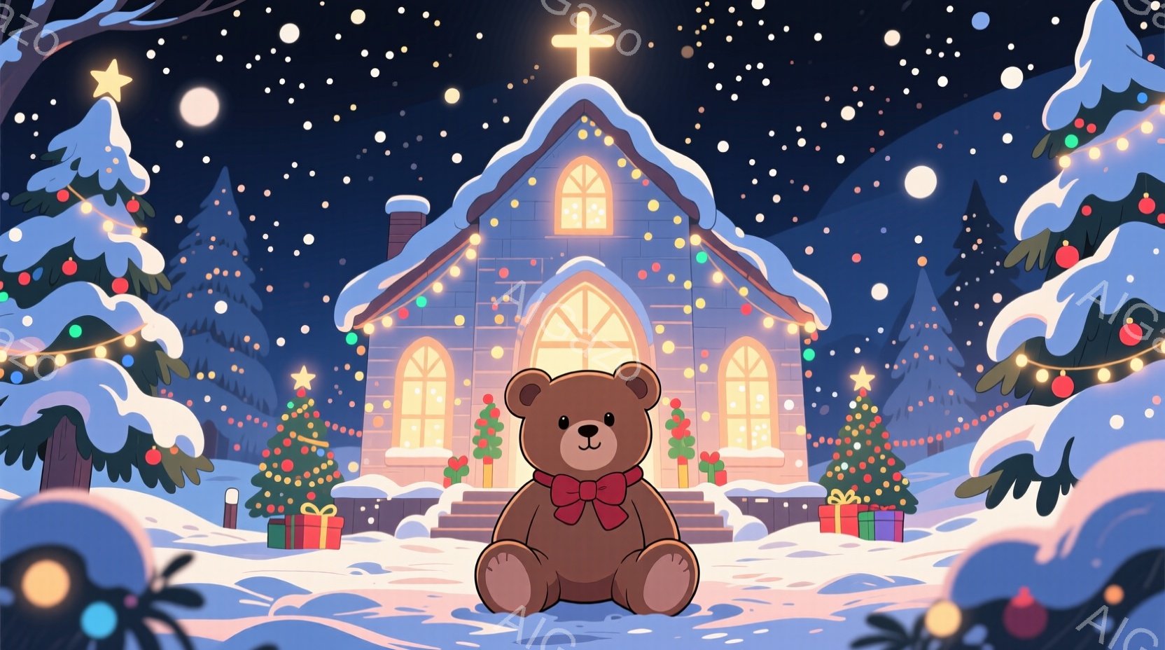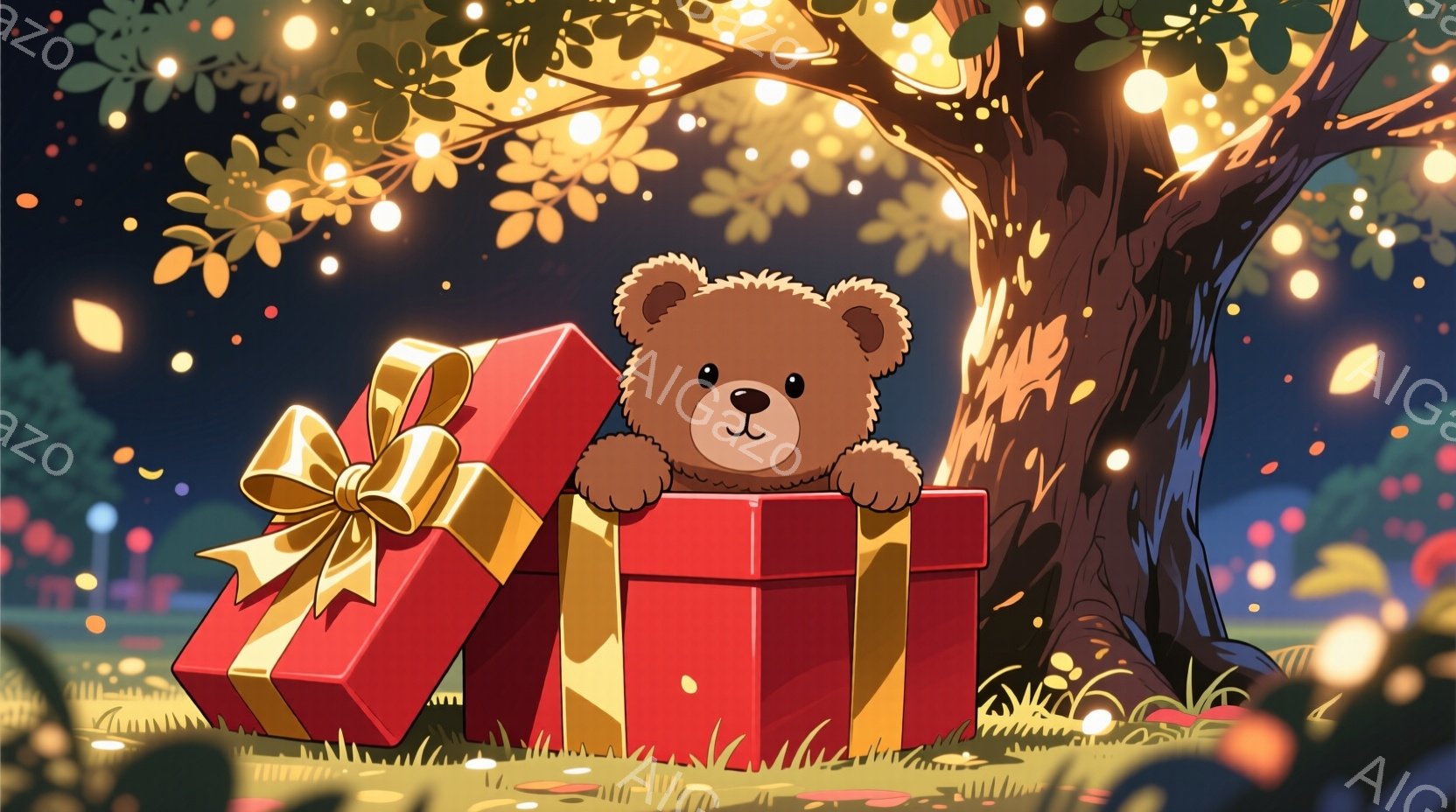 大きな赤いギフトボックスから茶色のテディベアが顔を出しています。背景には緑の草と花が咲き乱れ、木々から光の粒子が舞い散り、ファンタジーのような夜の雰囲気を醸し出しています。全体的に、贈り物と温かい気持ちを表現した、明るく可愛らしいイメージです。