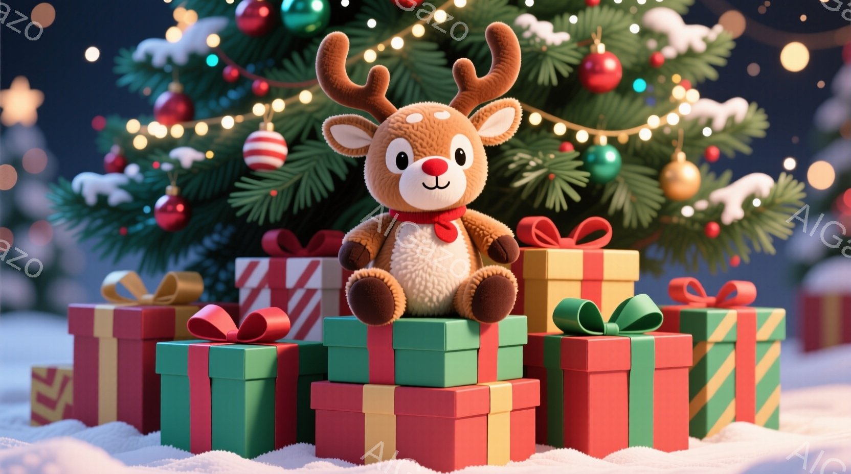 ぬいぐるみのような茶色のトナカイが、赤、緑、黄色のプレゼントの山の上に座っています。背景には、飾り付けられたクリスマスツリーとぼやけた光があり、雪が降っている様子が伺えます。全体的に温かく、お祝いの雰囲気で、クリスマスの喜びを表現しています。