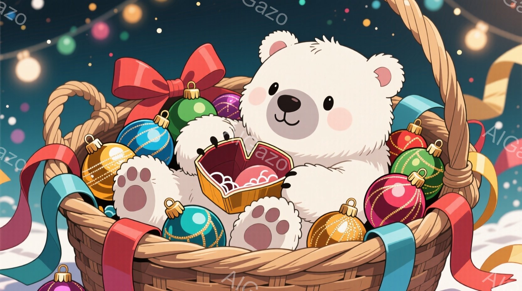 白い熊のぬいぐるみは、編み込みのバスケットの中に座っており、様々な色のクリスマスオーナメントに囲まれています。 ぬいぐるみは頬を赤らめ、穏やかな笑顔を見せており、可愛らしい印象を与えます。背景には雪が舞い、カラフルな電飾が輝き、温かくお祝いムードに満ちた雰囲気です。