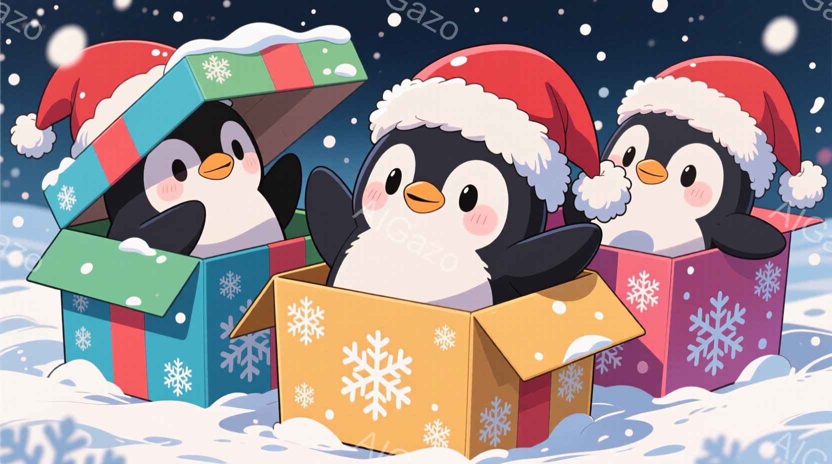 三羽のペンギンが、雪の結晶模様が描かれたギフトボックスの中に身を寄せ合って入っています。それぞれのペンギンは、赤いサンタ帽をかぶり、つぶらな瞳で微笑んでいます。背景は雪景色で、楽しげな冬の雰囲気が漂っています。