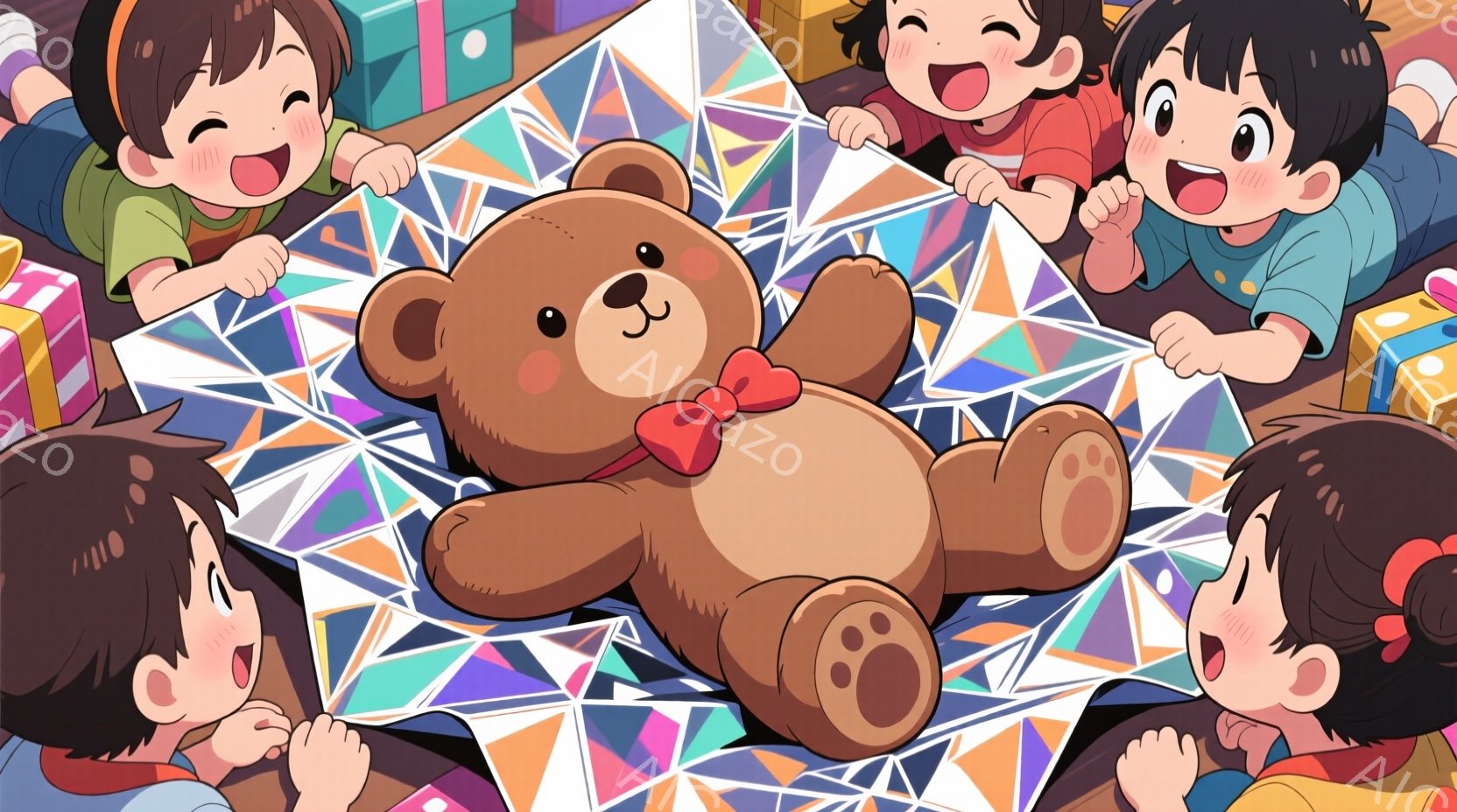 茶色のテディベアが、きらめく銀色の包装紙の中心に横たわっています。周りには、短い茶色の髪で、頬を赤らめ、笑顔を見せる幼い子供たちが集まっており、テディベアを囲んでいます。背景には、カラフルなギフトボックスがいくつか見え、全体的に暖かく、お祝いムードに満ちた雰囲気です。