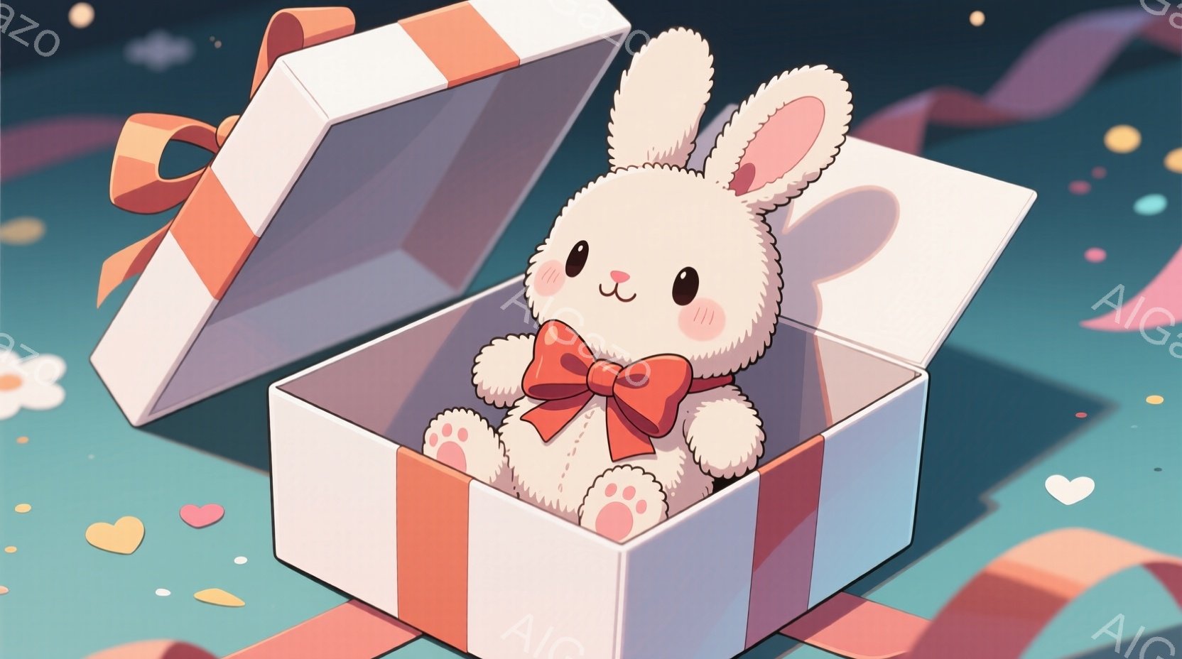 ふわふわの白いウサギが、赤いリボンと内側がピンク色のギフトボックスの中に座っています。ウサギは赤い蝶結びのリボンをつけており、ほほえんでいて、とても可愛らしい表情をしています。背景には、水色の背景と散らばった花びらが描かれており、全体的に温かく、お祝いのような雰囲気です。