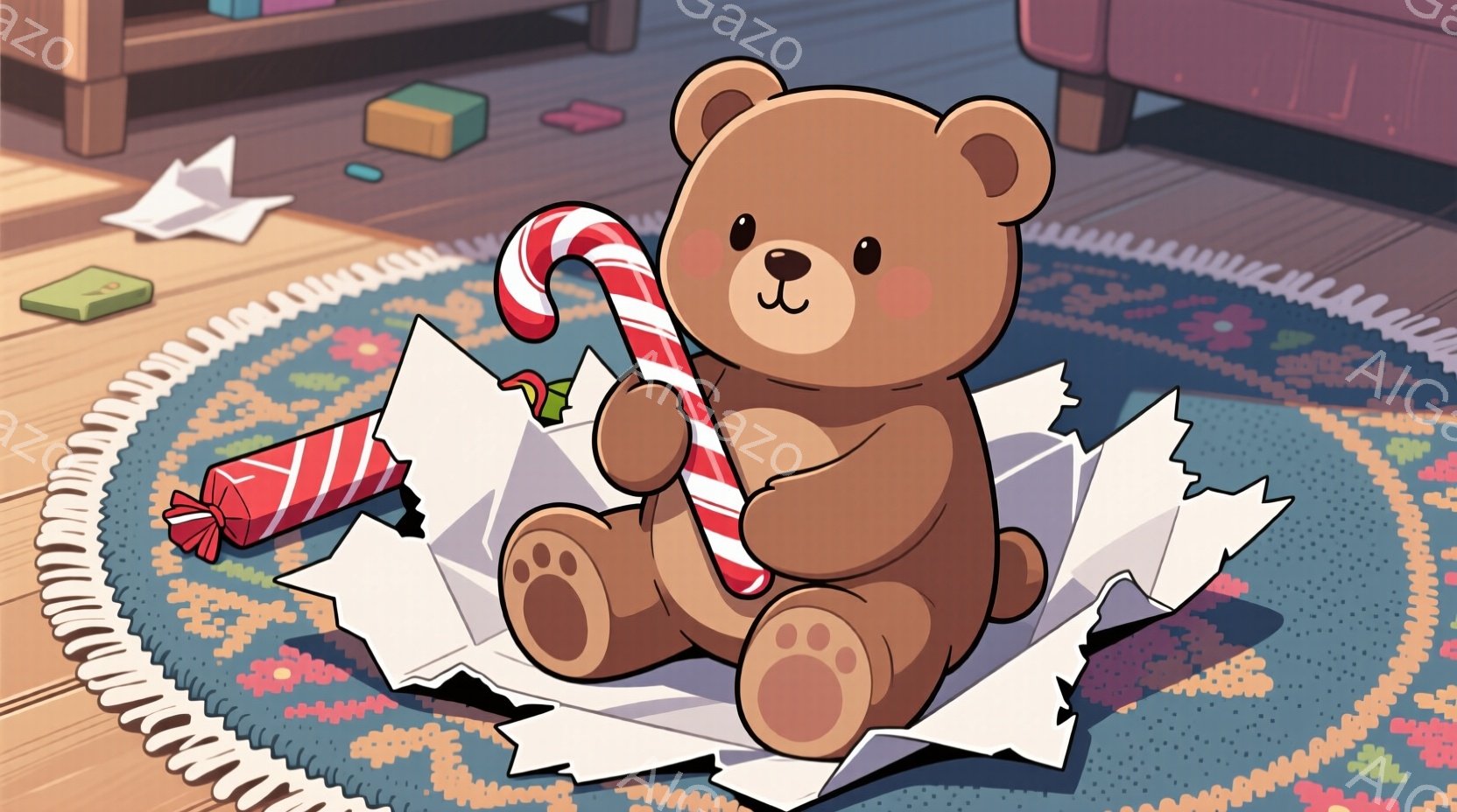 茶色のテディベアが、バラバラになった包装紙の中に座っています。右手にキャンディケーンを持っており、可愛らしい表情をしています。背景には木製の床とカラフルな円形のラグ、そしてプレゼントの箱が見え、クリスマスやホリデーシーズンを連想させる温かい雰囲気です。