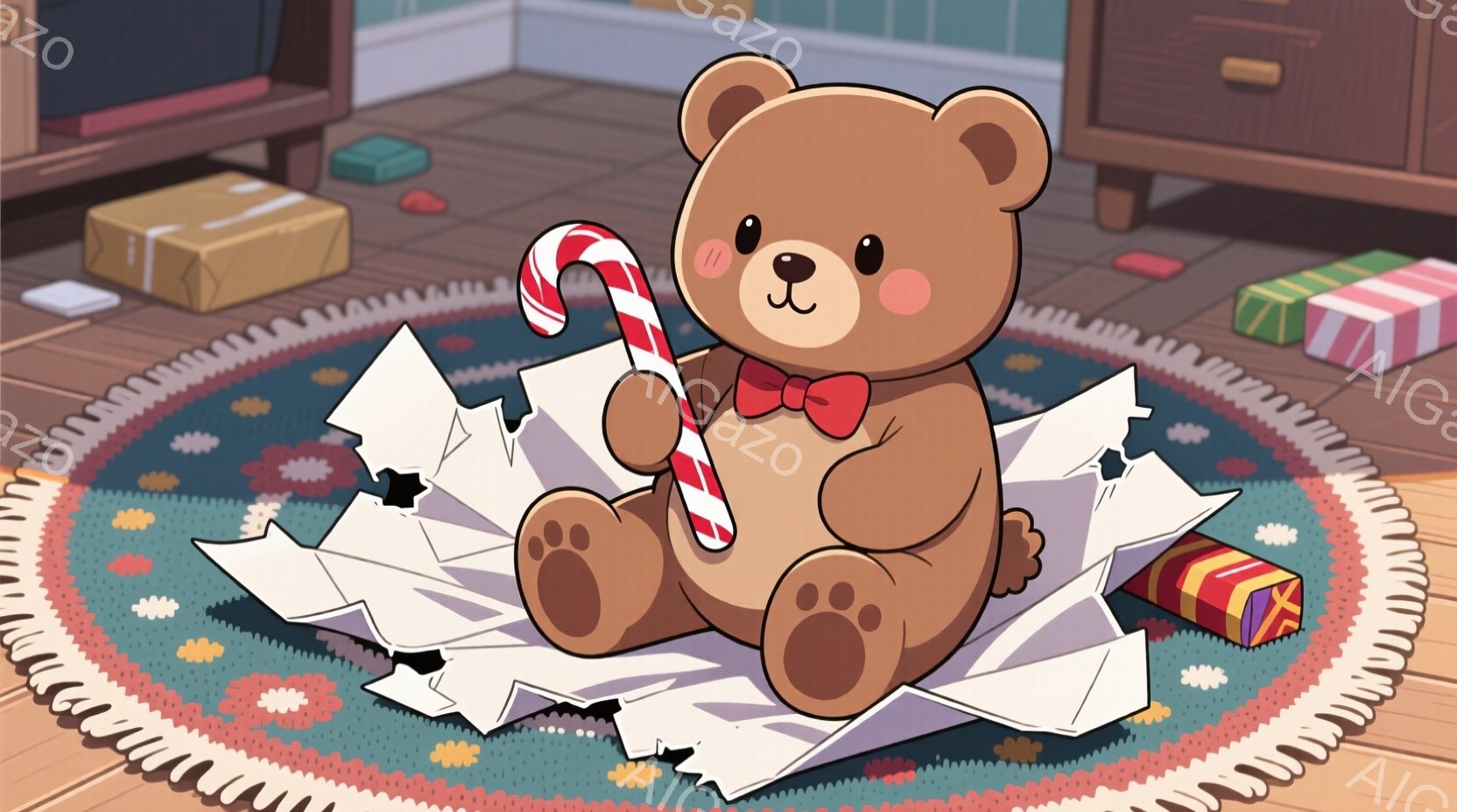 茶色のテディベアが、開けられたプレゼントの包装紙の上に座っています。赤いリボンを首に巻き、片手にキャンディケーンを持っています。背景には木製のキャビネットと敷物が敷かれた床があり、温かく、お祝いの雰囲気が漂っています。