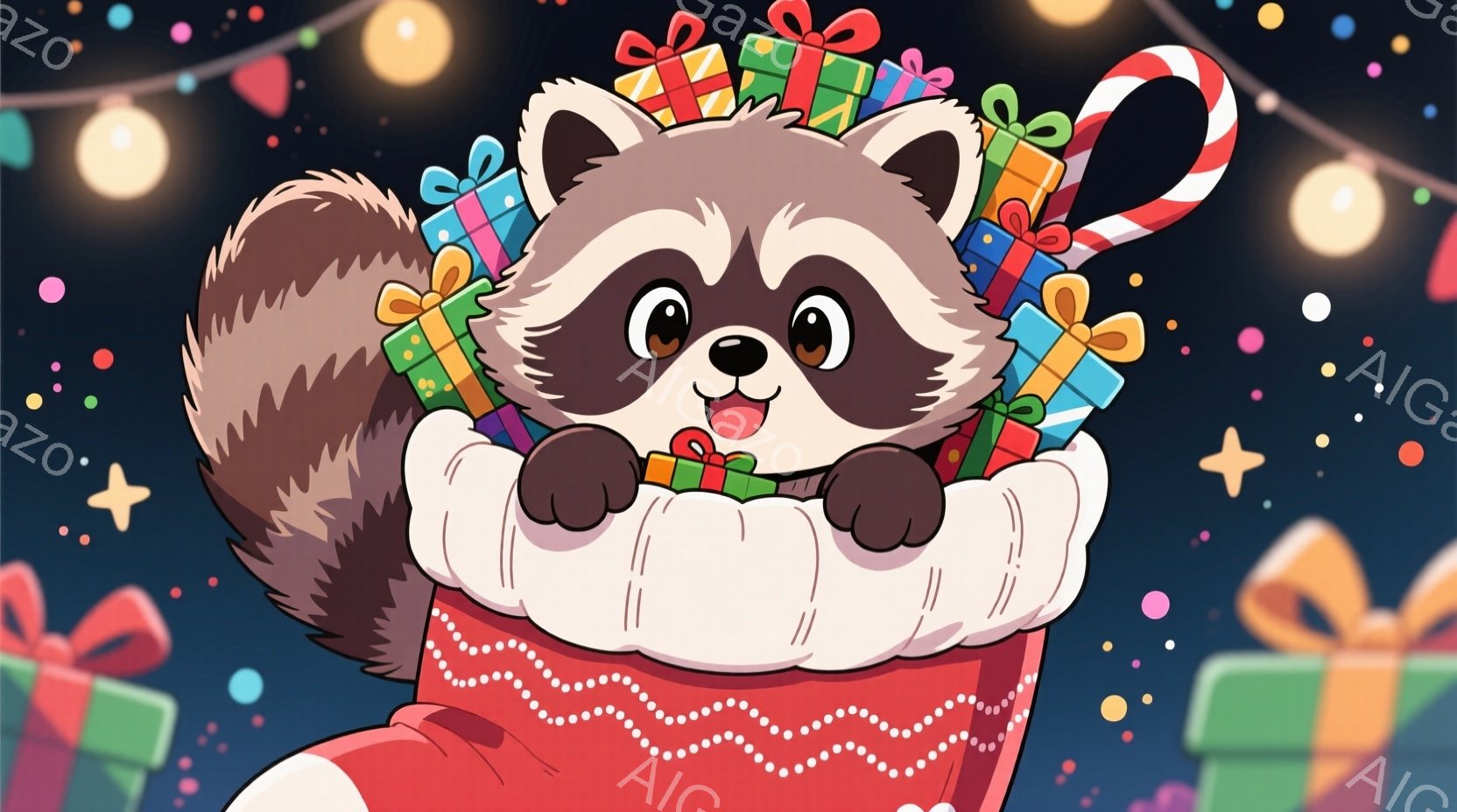 赤いクリスマスストッキングから、愛らしいアライグマが顔を出しています。アライグマは嬉しそうな表情で、プレゼントやキャンディケーンで満たされたストッキングの中から少し身を乗り出しています。背景には、緑色の木々と、色とりどりのクリスマスオーナメントや雪片が散りばめられており、暖かくお祝いムードに満ちています。
