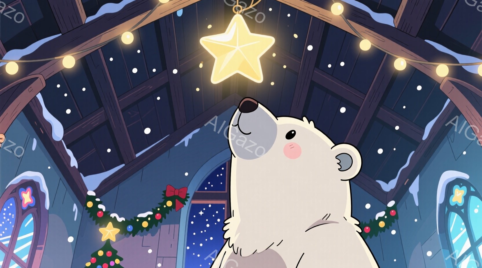 白い熊が上を見上げています。背景には、ステンドグラスの窓と星の飾り、そして輝く大きな星があり、まるで教会の内部のような空間です。全体的に、暖かく幻想的な雰囲気が漂っています。