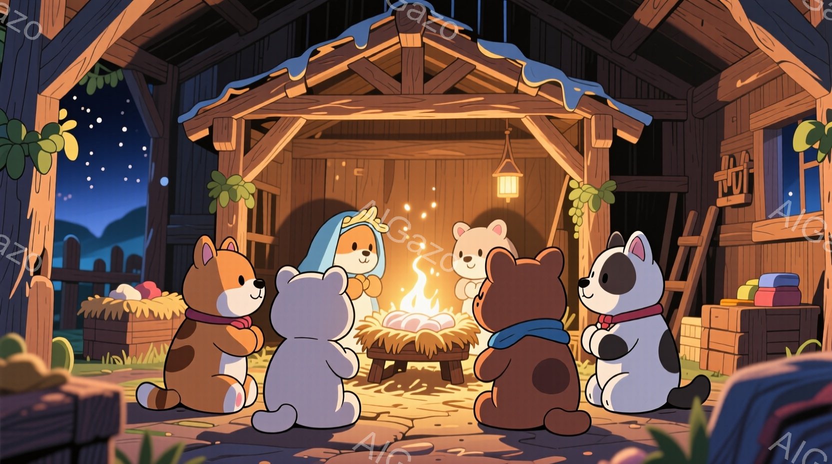 暖炉のような小屋の中で、動物たちが集まって何かを見つめている様子が描かれています。それぞれの動物は冬の衣装を着ており、明るい表情で中心を見つめています。背景には、雪の降る夜の風景と小さな家々が描かれており、全体的に暖かく、お祝いムードに満ちた雰囲気です。
