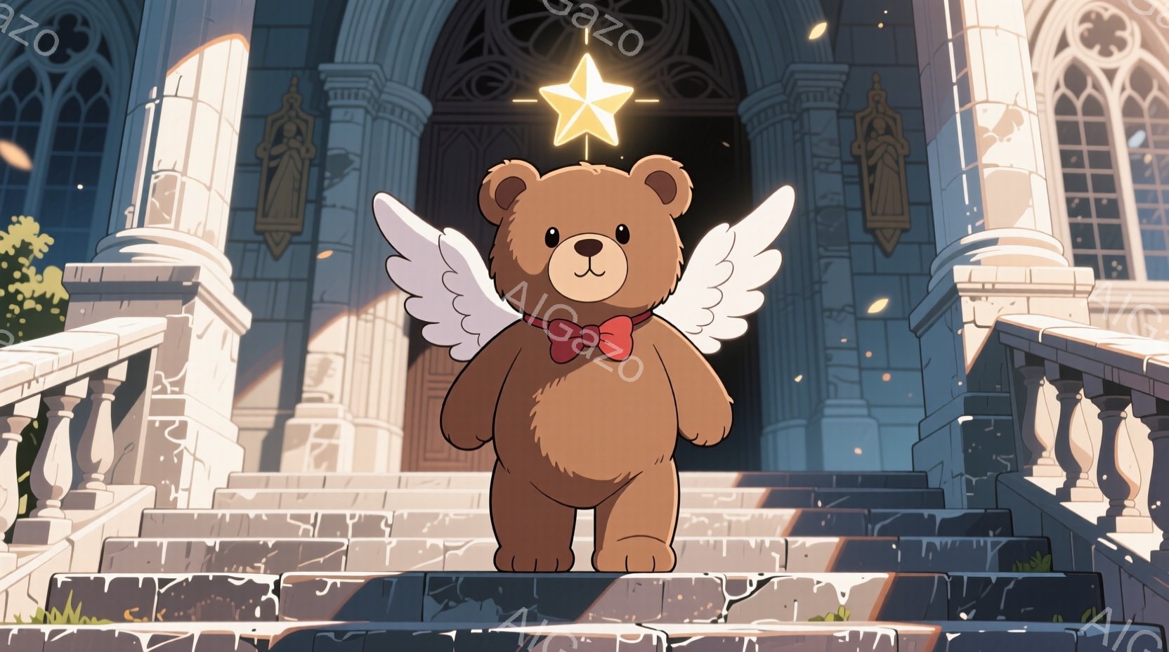 茶色のテディベアが、白い翼と赤いリボンをつけて階段の上に立っている。背景には、高いアーチ状の窓と石造りの階段が連なる壮大な建物があり、薄暗い光が差し込んでいる。全体的に、幻想的で温かい雰囲気を感じさせるイラストである。