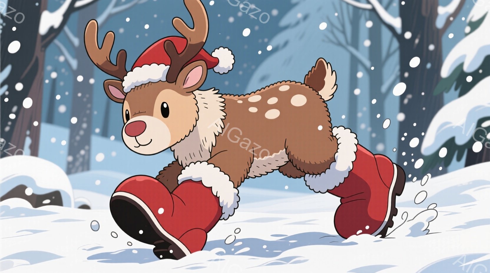 クリスマスの衣装を着たトナカイが雪の中を走っている様子を描いています。トナカイは赤いブーツと白い襟巻きをつけ、頭にはサンタ帽をかぶっており、元気いっぱいの表情で前進しています。背景には雪に覆われた木々と舞い散る雪があり、冬の暖かく幸せな雰囲気を醸し出しています。