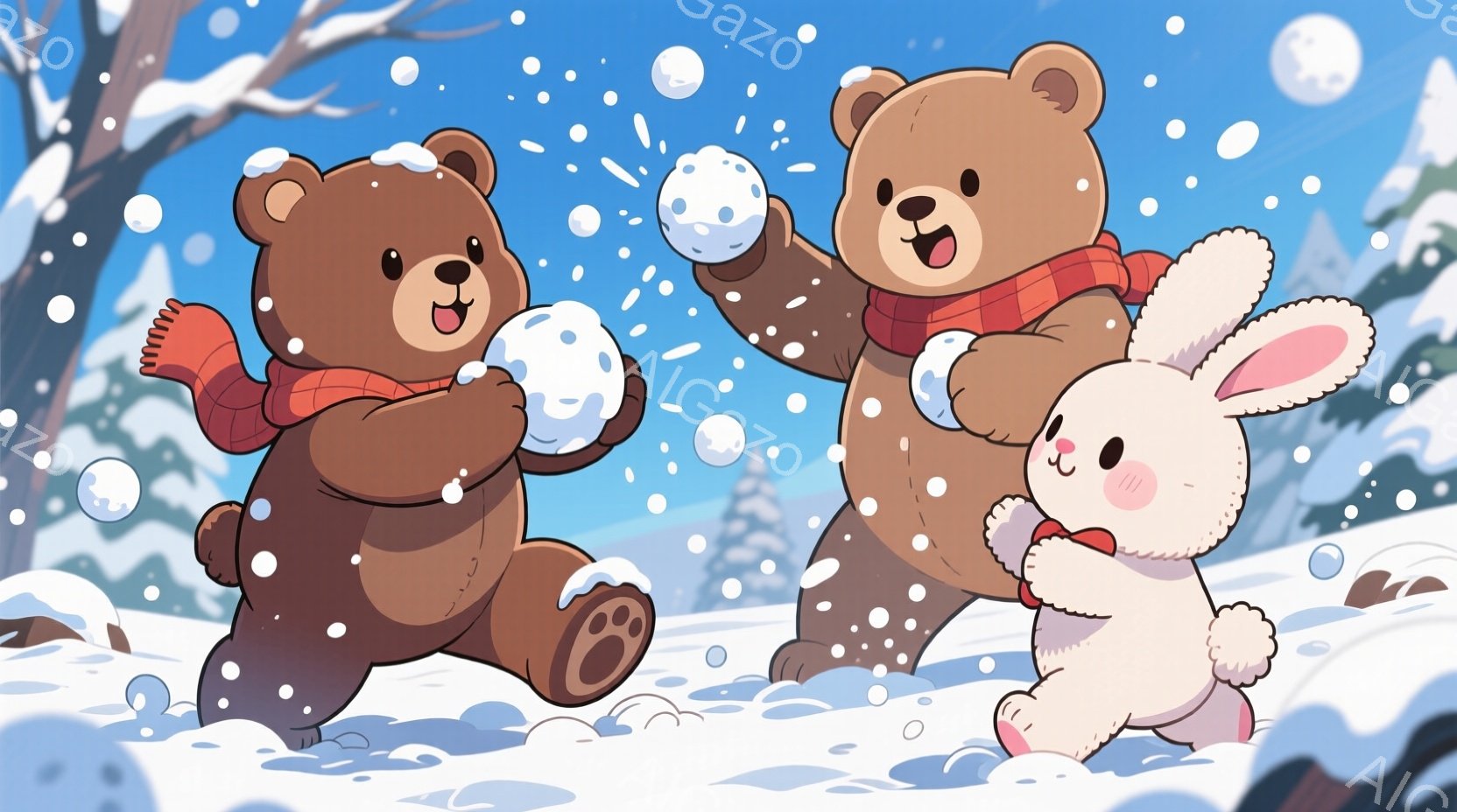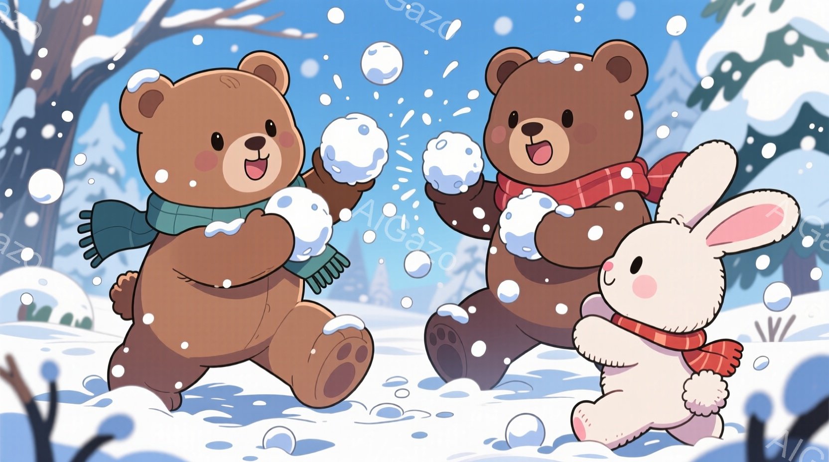 雪景色の中で、クマの親子とウサギが雪合戦を楽しんでいます。大きなクマは赤いマフラーを巻き、小さなクマとウサギは同じく赤いマフラーを巻いています。背景には雪に覆われた木々があり、空からは雪が舞い降りており、全体的に温かく幸せな雰囲気が漂っています。