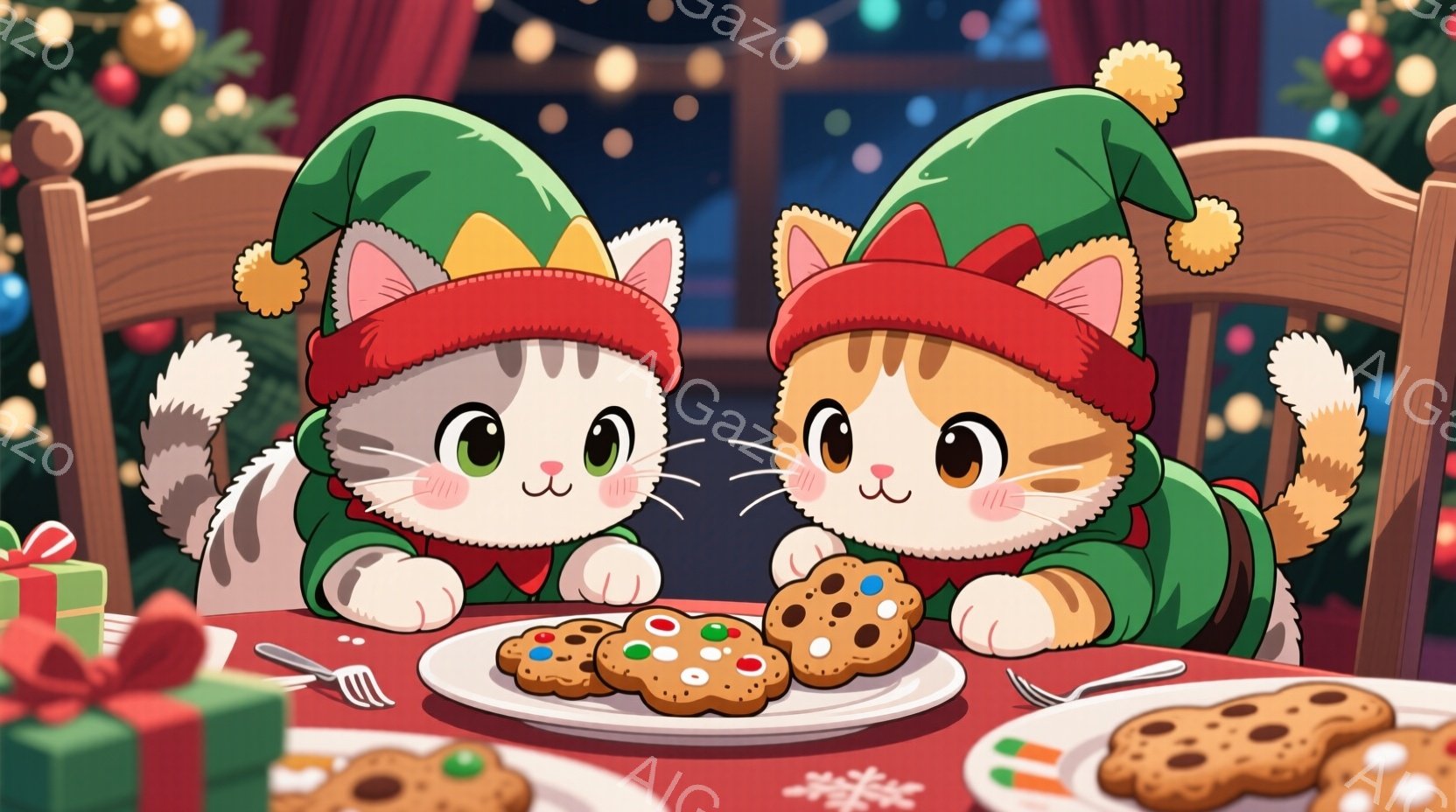 オレンジ色のしま模様の猫と灰色のしま模様の猫が、それぞれ緑色のクリスマスエルフの帽子をかぶってテーブルを挟んで座っています。二匹とも、大きな瞳で少し上目遣いをしており、テーブルに置かれたクッキーを見つめています。背景にはクリスマスツリーの飾りやプレゼント箱、そして柔らかな光が灯るキャンドルがあり、暖かく幸せなクリスマスの雰囲気が漂っています。