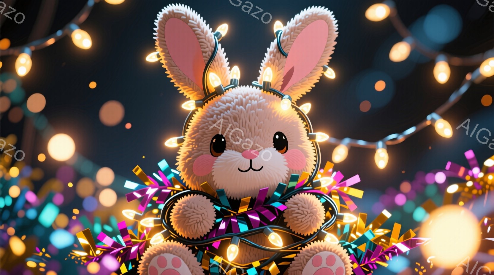 クリスマスの飾り付けの電飾に包まれたかわいらしい茶色のウサギを描いています。ウサギは丸く、大きな瞳と小さな鼻を持っており、リラックスした表情を浮かべています。背景は様々な色のきらめく光で満たされ、お祝いと温かい雰囲気を醸し出しています。