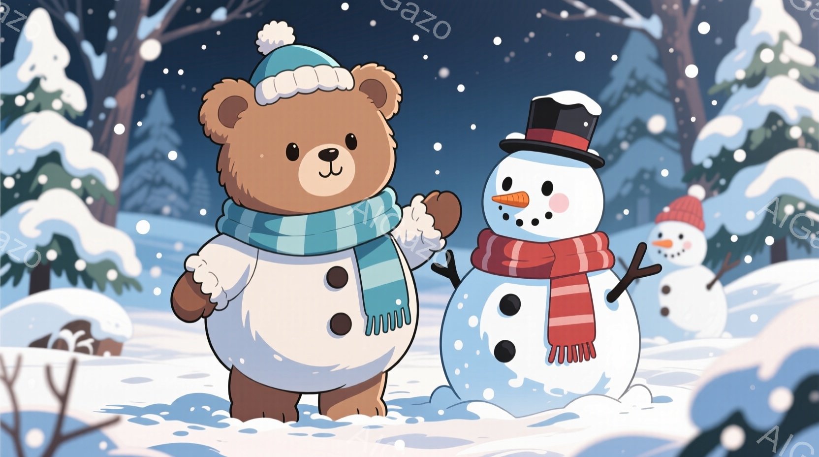雪景色の中に、クマのぬいぐるみと二つの雪だるまが立っています。クマは赤いニット帽とマフラーを身につけ、雪だるまはそれぞれ帽子とマフラーをつけ、にっこりと微笑んでいます。背景には雪に覆われた木々と白い雪が舞い散る冬の風景が広がっており、温かく穏やかな雰囲気を醸し出しています。